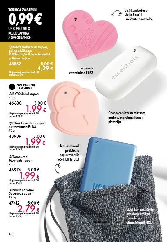 140 torbica za sapun 0,99€ uz kupnju bilo kojeg sapuna s ove stranice dizajniran za čišćenje, osvježenje i zaštitu. formuliran s vitaminima e i b3. s mirisom božura 'julia rose' i ružičaste borovnice posljednji put u katalogu! obogaćen slatkim mirisom maline, marshmallowa i pistacija jednostavno i praktično - sapun vam više neće kliziti iz ruku! e men's torbica za sapun, piling i čišćenje veličina: 19,5 x 11,5 cm. materijal: poliester i najlon. 48552 5,00 € 4,29 € najniža cijena u zadnjih 30 dana: 3,79 € a b c d e formulan s vitaminima e i b3 d north for men subzero sapun 100 g. 47412 5,00 € 2,79 € najniža cijena u zadnjih 30 dana: 2,79 € c treasured moments sapun 75 g. 46974 3,00 € 1,99 € najniža cijena u zadnjih 30 dana: 1,99 € b glow essentials sapun s vitaminima e i b3 75 g. 43909 3,00 € 1,99 € najniža cijena u zadnjih 30 dana: 1,79 € a beyoutiful sapun 75 g. 46638 3,00 € 1,99 € najniža cijena u zadnjih 30 dana: 1,79 €