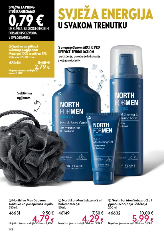 142 b North For Men Subzero 2 u 1 hidratantni gel 50 ml. 46149 7,50 € 4,29 € Najniža cijena u zadnjih 30 dana: 3,99 € a North For Men Subzero sredstvo za pranje kose i tijela 250 ml. 46631 9,50 € 4,79 € Najniža cijena u zadnjih 30 dana: 4,99 € c North For Men Subzero 2 u 1 pjena za brijanje i čišćenje 200 ml. 46632 10,00 € 5,99 € Najniža cijena u zadnjih 30 dana: 5,79 € S unaprijeđenom ARCTIC PRO DEFENCE TEHNOLOGIJOM za čišćenje, povećanje hidratacije i zaštitu vaše kože. SPUŽVA ZA PILING I TUŠIRANJE SAMO 0,79 € UZ KUPNJU BILO KOJEG NORTH FOR MEN PROIZVODA S OVE STRANICE S aktivnim ugljenom c d Spužva za piling i tuširanje s ugljenom Materijal: 100% reciklirani RPE. Veličina: 12 x 10,5 cm. 47545 3,50 € 2,79 € Najniža cijena u zadnjih 30 dana: 3,50 € SVJEŽA ENERGIJA U SVAKOM TRENUTKU d c b a