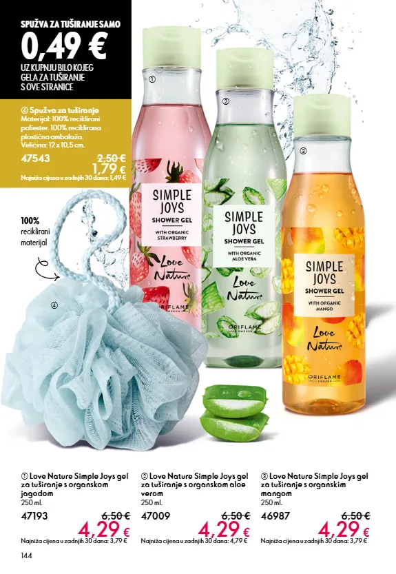 144 d spužva za tuširanje materijal: 100% reciklirani poliester. 100% reciklirana plastična ambalaža. veličina: 12 x 10,5 cm. 47543 2,50 € 1,79 € najniža cijena u zadnjih 30 dana: 1,49 € spužva za tuširanje samo 0,49 € uz kupnju bilo kojeg gela za tuširanje s ove stranice 100% reciklirani materijal c b a d a love nature simple joys gel za tuširanje s organskom jagodom 250 ml. 47193 6,50 € 4,29 € najniža cijena u zadnjih 30 dana: 3,79 € b love nature simple joys gel za tuširanje s organskom aloe verom 250 ml. 47009 6,50 € 4,29 € najniža cijena u zadnjih 30 dana: 4,79 € c love nature simple joys gel za tuširanje s organskim mangom 250 ml. 46987 6,50 € 4,29 € najniža cijena u zadnjih 30 dana: 3,79 €