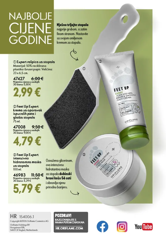 hr pozdrav! razgovarajte s nama putem chata na hr.oriflame.com copyright ©2026 oriflame cosmetics ag oriflame holdings bv hoogstraat 10b, 5462 cx veghel, netherlands c feet up expert intenzivno hidratantna maska za stopala 100 ml. 46983 11,50 € najniža cijena u zadnjih 30 dana: 6,29 € 5,79 € b feet up expert krema za oporavak ispucalih peta i glatka stopala 75 ml. 47008 9,50 € najniža cijena u zadnjih 30 dana: 9,00 € a expert rašpica za stopala materijal: 50% reciklirana plastika i brusni papir. veličina: 23 x 6,5 cm. 47427 6,00 € najniža cijena u zadnjih 30 dana: 5,50 € 4,79€ 2,99€ najbolje cijene godine nježno trljajte stopala najprije grubom, a zatim finom stranom. nastavite sa svojom omiljenom kremom za stopala. osnažena glicerinom, ova intenzivno hidratantna maska za stopala dubinski hrani kožu 56 sati i obnavlja njenu prirodnu barijeru. 154006.1 a b c