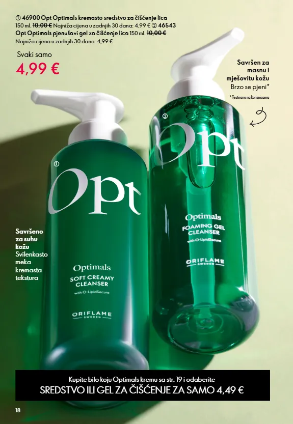 18 Savršeno za suhu kožu Svilenkasto meka kremasta tekstura Savršen za masnu i mješovitu kožu 4,99 € a 46900 Opt Optimals kremasto sredstvo za čišćenje lica 150 ml. 10,00 € Najniža cijena u zadnjih 30 dana: 4,99 € b 46543 Opt Optimals pjenušavi gel za čišćenje lica 150 ml. 10,00 € Najniža cijena u zadnjih 30 dana: 4,99 € Brzo se pjeni* * Testirano na korisnicama a b Kupite bilo koju Optimals kremu sa str. 19 i odaberite SREDSTVO ILI GEL ZA ČIŠĆENJE ZA SAMO 4,49 € Svaki samo