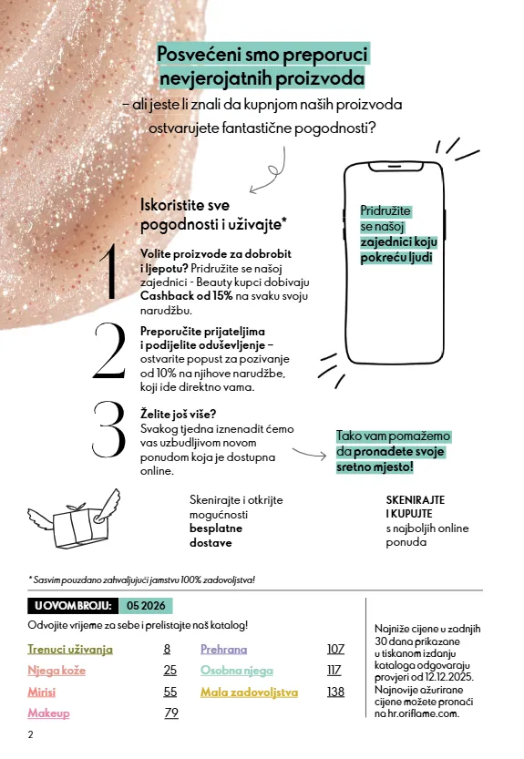2 05 2026 Tako vam pomažemo da pronađete svoje sretno mjesto! Odvojite vrijeme za sebe i prelistajte naš katalog! Posvećeni smo preporuci nevjerojatnih proizvoda – ali jeste li znali da kupnjom naših proizvoda ostvarujete fantastične pogodnosti? Iskoristite sve pogodnosti i uživajte* Preporučite prijateljima i podijelite oduševljenje – ostvarite popust za pozivanje od 10% na njihove narudžbe, koji ide direktno vama. Želite još više? Svakog tjedna iznenadit ćemo vas uzbudljivom novom ponudom koja je dostupna online. Volite proizvode za dobrobit i ljepotu? Pridružite se našoj zajednici - Beauty kupci dobivaju Cashback od 15% na svaku svoju narudžbu. * Sasvim pouzdano zahvaljujući jamstvu 100% zadovoljstva! SKENIRAJTE I KUPUJTE s naj boljih online ponuda Skenirajte i otkrijte mogućnosti besplatne dostave Pridružite se našoj zajednici koju pokreću ljudi U OVOM BROJU: Najniže cijene u zadnjih 30 dana prikazane u tiskanom izdanju kataloga odgovaraju provjeri od 12.12.2025. Najnovije ažurirane cijene možete pronaći na hr.oriflame.com. Makeup Mirisi Prehrana Mala zadovoljstva Trenuci uživanja 8 25 55 79 107 117 138 Njega kože Osobna njega