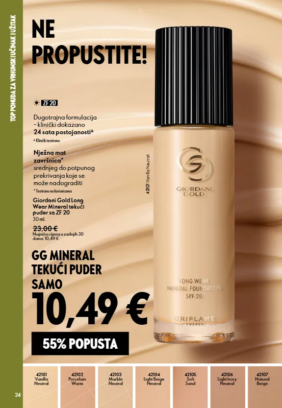 ZF 20 24 NE PROPUSTITE! 42101 Vanilla Neutral 42103 Marble Neutral 42105 Soft Sand 42102 Porcelain Warm 42104 Light Beige Neutral 42106 Light Ivory Neutral 42107 Natural Beige 10,49€ Giordani Gold Long Wear Mineral tekući puder sa ZF 20 30 ml. 23,00 € Najniža cijena u zadnjih 30 dana: 10,49 € GG MINERAL TEKUĆI PUDER SAMO Dugotrajna formulacija – klinički dokazano 24 sata postojanosti ∆ Nježna mat završnica* srednjeg do potpunog prekrivanja koje se može nadograditi TOP PONUDA ZA VRHUNSKI UČINAK I UŽITAK 55% POPUSTA ∆ Klinički testirano * Testirano na korisnicama 42101 Vanilla Neutral