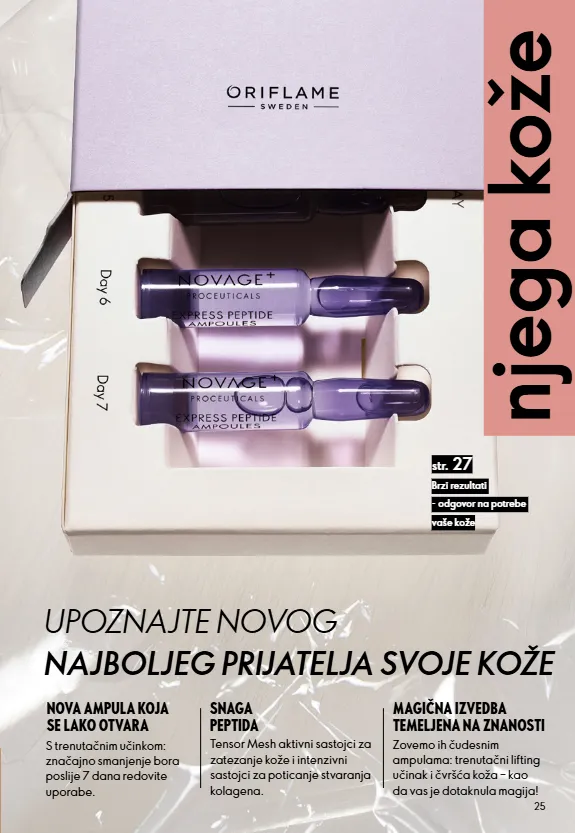 SECTION NAME 25 njega kože str. 27 UPOZNAJTE NOVOG NAJBOLJEG PRIJATELJA SVOJE KOŽE NOVA AMPULA KOJA SE LAKO OTVARA S trenutačnim učinkom: značajno smanjenje bora poslije 7 dana redovite uporabe. SNAGA PEPTIDA Tensor Mesh aktivni sastojci za zatezanje kože i intenzivni sastojci za poticanje stvaranja kolagena. MAGIČNA IZVEDBA TEMELJENA NA ZNANOSTI Zovemo ih čudesnim ampulama: trenutačni lifting učinak i čvršća koža – kao da vas je dotaknula magija! Brzi rezultati - odgovor na potrebe vaše kože