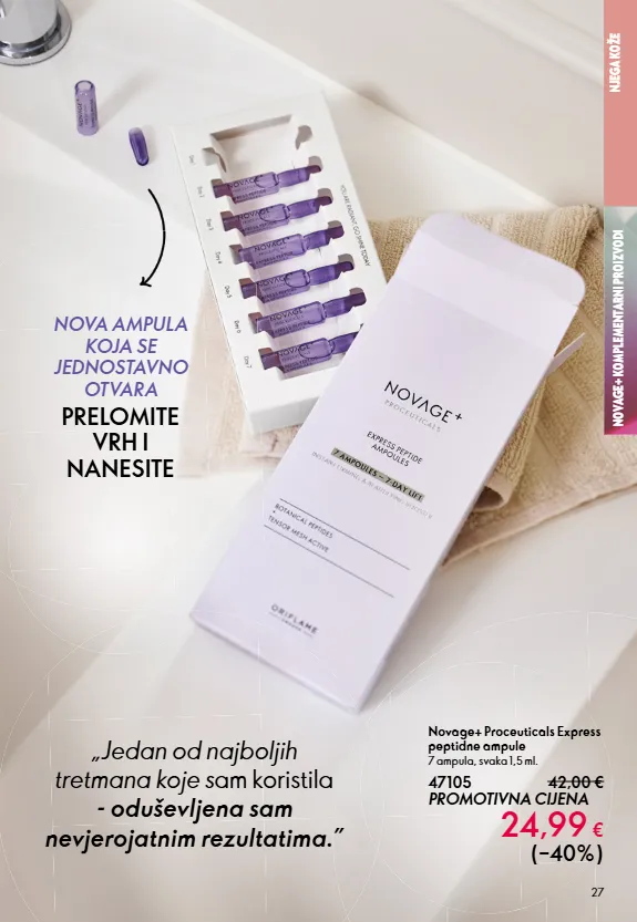 SECTION NAME 27 NJEGA KOŽE Novage+ Proceuticals Express peptidne ampule 7 ampula, svaka 1,5 ml. 47105 42,00 € PROMOTIVNA CIJENA 24,99 € (–40%) NOVAGE+ KOMPLEMENTARNI PROIZVODI PRELOMITE VRH I NANESITE NOVA AMPULA KOJA SE JEDNOSTAVNO OTVARA „Jedan od najboljih tretmana koje s am koristila - oduševljena sam nevjerojatnim rezultatima.”