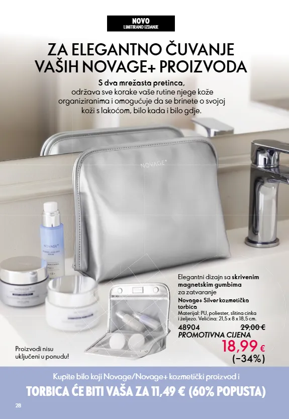 28 Novage+ Silver kozmetička torbica Materijal: PU, poliester, slitina cinka i željezo. Veličina: 21,5 x 8 x 18,5 cm. 48904 29,00 € PROMOTIVNA CIJENA 18,99 € (–34%) ZA ELEGANTNO ČUVANJE VAŠIH NOVAGE+ PROIZVODA Elegantni dizajn sa skrivenim magnetskim gumbima za zatvaranje S dva mrežasta pretinca, održava sve korake vaše rutine njege kože organiziranima i omogućuje da se brinete o svojoj koži s lakoćom, bilo kada i bilo gdje. Kupite bilo koji Novage/Novage+ kozmetički proizvod i TORBICA ĆE BITI VAŠA ZA 11,49 € (60% POPUSTA) NOVO LIMITIRANO IZDANJE Proizvodi nisu uključeni u ponudu!