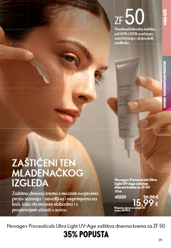 SECTION NAME 29 NJEGA KOŽE Novage+ Proceuticals Ultra Light UV-Age zaštitna dnevna krema sa ZF 50 30 ml. 41059 26,00 € 15,99 € Najniža cijena u zadnjih 30 dana: 18,99 € ZAŠTIĆENI TEN MLADENAČKOG IZGLEDA Zaštitna dnevna krema s moćnim svojstvima protiv starenja – nevidljiva i neprimjetna na koži, tako da možete slobodno i s povjerenjem uživati u suncu. Novage+ Proceuticals Ultra Light UV-Age zaštitna dnevna krema sa ZF 50 35% POPUSTA NOVAGE+ KOMPLEMENTARNI PROIZVODI Visokoučinkovita zaštita od UVA i UVB zračenja, onečišćenja i slobodnih radikala ZF 50