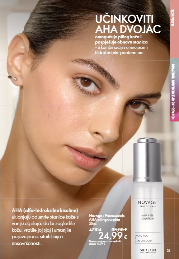 31 Novage+ Proceuticals AHA piling otopina 30 ml. 47104 33,00 € 24,99 € Najniža cijena u zadnjih 30 dana: 19,99 € NJEGA KOŽE AHA (alfa-hidroksilne kiseline) uklanjaju odumrle stanice kože s vanjskog sloja, da bi zagladile kožu, vratile joj sjaj i umanjile pojavu pora, sitnih linija i nesavršenosti. NOVAGE+ KOMPLEMENTARNI PROIZVODI UČINKOVITI AHA DVOJAC omogućuje piling kože i pospješuje obnovu stanica - u kombinaciji s umirujućim i hidratantnim pantenolom.