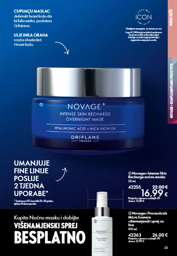 section name 33 b novage+ proceuticals micro essence višenamjenski sprej za lice 100 ml. 42263 26,00 € najniža cijena u zadnjih 30 dana: 12,99 € njega kože kupite noćnu masku i dobijte višenamjenski sprej besplatno umanjuje fine linije poslije 2 tjedna uporabe* * testirano na 117 žena dobi 35−50 godina tijekom 14 dana uporabe logo icon koristi se kako bi pokazao da proizvod(i) zadovoljava(ju) kriterije za naše najpopularnije i najprodavanije proizvode. omiljeno mnogima, stvoreno za vas ulje inka oraha vraća elasticitet i hrani kožu. cupuaçu maslac dubinski hrani kožu da bi bila meka, podatna i blistava. a novage+ intense skin recharge noćna maska 50 ml. 42255 22,00 € 16,99 € najniža cijena u zadnjih 30 dana: 21,00 € novage+ komplementarni proizvodi a b