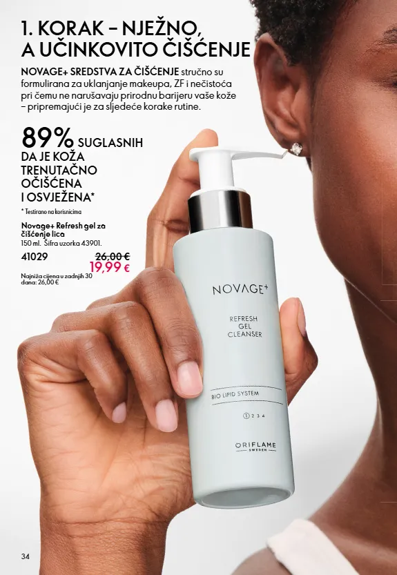 34 NOVAGE+ SREDSTVA ZA ČIŠĆENJE stručno su formulirana za uklanjanje makeupa, ZF i nečistoća pri čemu ne narušavaju prirodnu barijeru vaše kože – pripremajući je za sljedeće korake rutine. Novage+ Refresh gel za čišćenje lica 150 ml. Šifra uzorka 43901. 41029 26,00 € 19,99 € Najniža cijena u zadnjih 30 dana: 26,00 € 89% SUGLASNIH DA JE KOŽA TRENUTAČNO OČIŠĆENA I OSVJEŽENA* * Testirano na korisnicima 1. KORAK – NJEŽNO, A UČINKOVITO ČIŠĆENJE