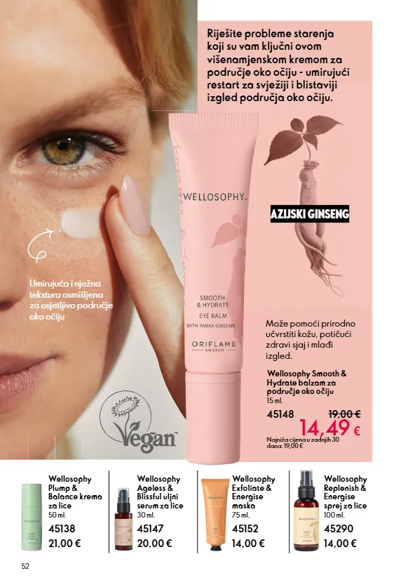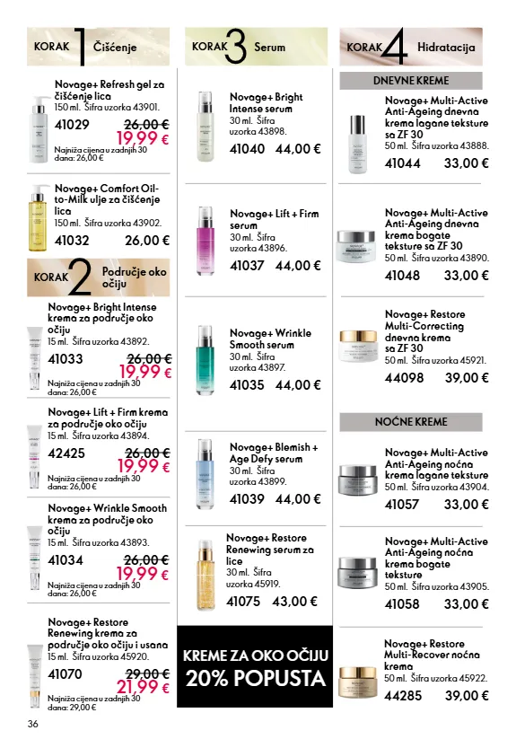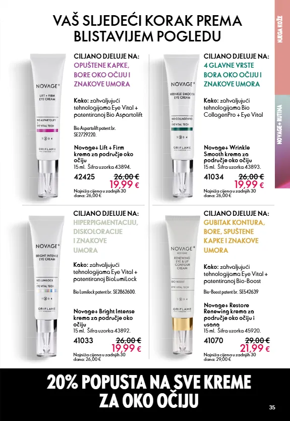 SECTION NAME 35 NJEGA KOŽE NOVAGE+ RUTINA Novage+ Lift + Firm krema za područje oko očiju 15 ml. Šifra uzorka 43894. 42425 26,00 € 19,99 € Najniža cijena u zadnjih 30 dana: 26,00 € Novage+ Wrinkle Smooth krema za područje oko očiju 15 ml. Šifra uzorka 43893. 41034 26,00 € 19,99 € Najniža cijena u zadnjih 30 dana: 26,00 € Novage+ Bright Intense krema za područje oko očiju 15 ml. Šifra uzorka 43892. 41033 26,00 € 19,99 € Najniža cijena u zadnjih 30 dana: 26,00 € Novage+ Restore Renewing krema za područje oko očiju i usana 15 ml. Šifra uzorka 45920. 41070 29,00 € 21,99 € Najniža cijena u zadnjih 30 dana: 29,00 € NJEGA KOŽE CILJANO DJELUJE NA: HIPERPIGMENTACIJU, DISKOLORACIJE I ZNAKOVE UMORA Kako: zahvaljujući tehnologijama Eye Vital + patentiranoj BioLumiLock Bio Lumilock patent br. SE2862600. CILJANO DJELUJE NA: OPUŠTENE KAPKE, BORE OKO OČIJU I ZNAKOVE UMORA Kako: zahvaljujući tehnologijama Eye Vital + patentiranoj Bio Aspartolift CILJANO DJELUJE NA: 4 GLAVNE VRSTE BORA OKO OČIJU I ZNAKOVE UMORA Kako: zahvaljujući tehnologijama Bio CollagenPro + Eye Vital Bio Aspartolift patent br. SE2729220. CILJANO DJELUJE NA: GUBITAK KONTURA, BORE, SPUŠTENE KAPKE I ZNAKOVE UMORA Kako: zahvaljujući tehnologijama Eye Vital + patentiranoj Bio-Boost Bio-Boost patent br. SE542639 VAŠ SLJEDEĆI KORAK PREMA BLISTAVIJEM POGLEDU 20% POPUSTA NA SVE KREME ZA OKO OČIJU