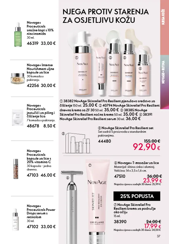SECTION NAME 37 e NovAge Skinrelief Pro Resilient set Set sadrži 5 proizvoda u standardnim pakiranjima. 44480 155,00 € 92,90 € f Novage+ T-masažer za lice Materijal: slitina cinka i aluminij. Veličina: 14 x 3,5 x 1,6 cm. 47510 36,00 € 23,99 € Najniža cijena u zadnjih 30 dana: 25,99 € g NovAge Skinrelief Pro Resilient krema za područje oko očiju 15 ml. 38390 24,00 € 17,99 € Najniža cijena u zadnjih 30 dana: 24,00 € a 38382 NovAge Skinrelief Pro Resilient pjenušavo sredstvo za čišćenje 150ml. 25,00€ b 40794 NovAge Skinrelief Pro Resilient dnevna krema sa ZF 30 50ml. 35,00€ c 38385 NovAge Skinrelief Pro Resilient noćna krema 50ml. 35,00€ d 38391 NovAge Skinrelief Pro Resilient serum 30ml. 36,00€ Novage+ Intense Nourishment uljne kapsule za lice 30 komada u pakiranju. 42256 30,00 € Novage+ Proceuticals snažne kapi s 10% niacinamida 30 ml. 46319 33,00 € Novage+ Proceuticals Power Drops serum s retinolom 30 ml. 47102 33,00 € Novage+ Proceuticals kapsule za lice s 20% vitamina C 30 kapsula – jedna dnevno. 47103 46,00 € Novage+ Proceuticals jastučići za piling i čišćenje lica 7 komada u pakiranju. 48678 8,50 € NJEGA PROTIV STARENJA ZA OSJETLJIVU KOŽU NJEGA KOŽE NOVAGE+ RUTINA NJEGA KOŽE 25% POPUSTA a b c d e f g