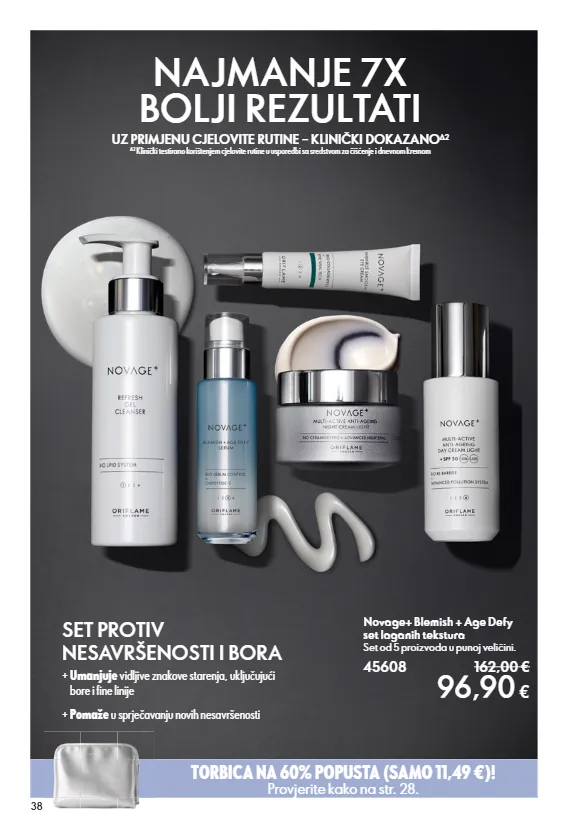 38 Novage+ Blemish + Age Defy set laganih tekstura Set od 5 proizvoda u punoj veličini. 45608 162,00 € 96,90 € + Umanjuje vidljive znakove starenja, uključujući bore i fine linije + Pomaže u sprječavanju novih nesavršenosti SET PROTIV NESAVRŠENOSTI I BORA NAJMANJE 7X BOLJI REZULTATI UZ PRIMJENU CJELOVITE RUTINE – KLINIČKI DOKAZANO ∆2 ∆2 Klinički testirano korištenjem cjelovite rutine u usporedbi sa sredstvom za čišćenje i dnevnom kremom TORBICA NA 60% POPUSTA (SAMO 11,49 €)! Provjerite kako na str. 28.