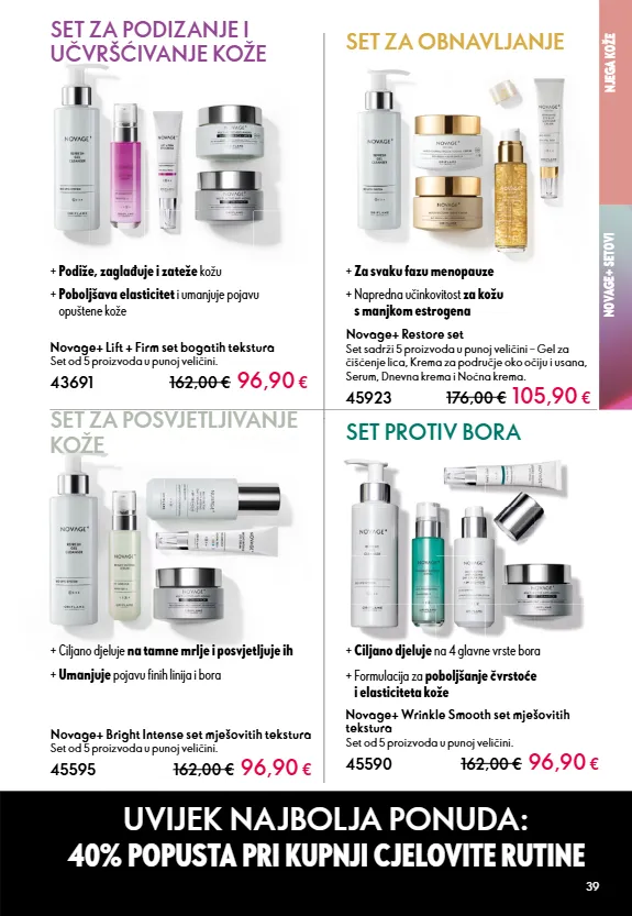 39 Novage+ Lift + Firm set bogatih tekstura Set od 5 proizvoda u punoj veličini. 43691 162,00 € 96,90 € Novage+ Bright Intense set mješovitih tekstura Set od 5 proizvoda u punoj veličini. 45595 162,00 € 96,90 € Novage+ Wrinkle Smooth set mješovitih tekstura Set od 5 proizvoda u punoj veličini. 45590 162,00 € 96,90 € + Napredna učinkovitost za kožu s manjkom estrogena + Za svaku fazu menopauze Novage+ Restore set Set sadrži 5 proizvoda u punoj veličini – Gel za čišćenje lica, Krema za područje oko očiju i usana, Serum, Dnevna krema i Noćna krema. 45923 176,00 € 105,90 € + Umanjuje pojavu finih linija i bora + Ciljano djeluje na tamne mrlje i posvjetljuje ih + Formulacija za poboljšanje čvrstoće i elasticiteta kože + Ciljano djeluje na 4 glavne vrste bora SET PROTIV BORA SET ZA POSVJETLJIVANJE KOŽE SET ZA OBNAVLJANJE SET ZA PODIZANJE I UČVRŠĆIVANJE KOŽE + Poboljšava elasticitet i umanjuje pojavu opuštene kože + Podiže, zaglađuje i zateže kožu UVIJEK NAJBOLJA PONUDA: 40% POPUSTA PRI KUPNJI CJELOVITE RUTINE NJEGA KOŽE NOVAGE+ SETOVI