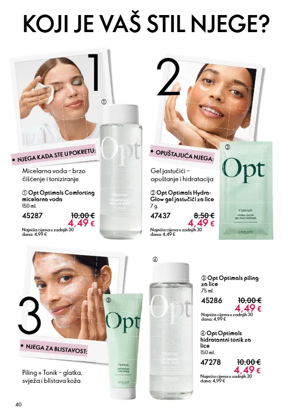 40 Piling + Tonik – glatka, svježa i blistava koža c Opt Optimals piling za lice 75 ml. 45286 10,00 € 4,49 € Najniža cijena u zadnjih 30 dana: 4,99 € a Opt Optimals Comforting micelarna voda 150 ml. 45287 10,00 € 4,49 € Najniža cijena u zadnjih 30 dana: 4,99 € d Opt Optimals hidratantni tonik za lice 150 ml. 47278 10,00 € 4,49 € Najniža cijena u zadnjih 30 dana: 4,99 € b Opt Optimals Hydra- Glow gel jastučići za lice 7 g. 47437 8,50 € 4,49 € Najniža cijena u zadnjih 30 dana: 4,49 € 1 2 3 KOJI JE VAŠ STIL NJEGE? • NJEGA KADA STE U POKRETU: • OPUŠTAJUĆA NJEGA: • NJEGA ZA BLISTAVOST: Micelarna voda – brzo čišćenje i toniziranje Gel jastučići – opuštanje i hidratacija a b c d