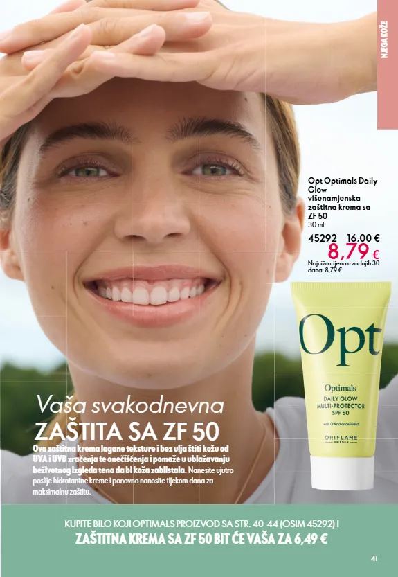 SECTION NAME 41 NJEGA KOŽE Ova zaštitna krema lagane teksture i bez ulja štiti kožu od UVA i UVB zračenja te onečišćenja i pomaže u ublažavanju beživotnog izgleda tena da bi koža zablistala . Nanesite ujutro poslije hidratantne kreme i ponovno nanosite tijekom dana za maksimalnu zaštitu. Opt Optimals Daily Glow višenamjenska zaštitna krema sa ZF 50 30 ml. 45292 16,00 € 8,79 € Najniža cijena u zadnjih 30 dana: 8,79 € Vaša svakodnevna ZAŠTITA SA ZF 50 KUPITE BILO KOJI OPTIMALS PROIZVOD SA STR. 40-44 (OSIM 45292) I ZAŠTITNA KREMA SA ZF 50 BIT ĆE VAŠA ZA 6,49 €