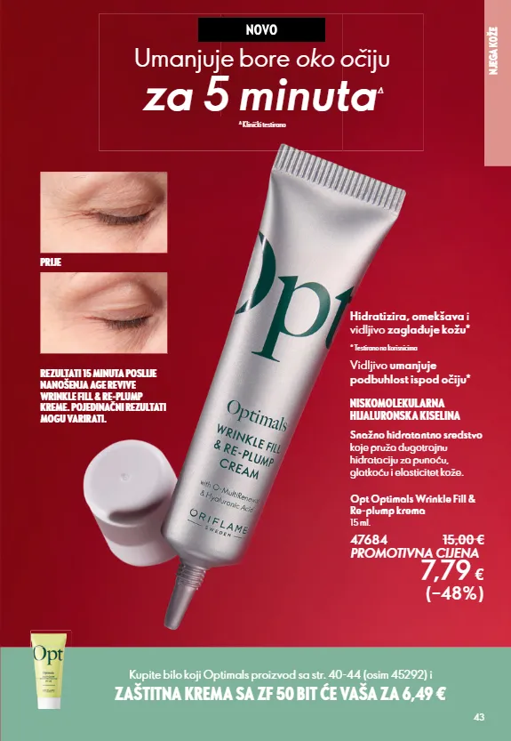 SECTION NAME 43 Opt Optimals Wrinkle Fill & Re-plump krema 15 ml. 47684 15,00 € PROMOTIVNA CIJENA 7,79 € (–48%) NOVO Hidratizira, omekšava i vidljivo zaglađuje kožu* Vidljivo umanjuje podbuhlost ispod očiju* Snažno hidratantno sredstvo koje pruža dugotrajnu hidrataciju za punoću, glatkoću i elasticitet kože. NISKOMOLEKULARNA HIJALURONSKA KISELINA NOVO Umanjuje bore oko oč iju za 5 minuta ∆ ∆ Klinički testirano * Testirano na korisnicima REZULTATI 15 MINUTA POSLIJE NANOŠENJA AGE REVIVE WRINKLE FILL & RE-PLUMP KREME. POJEDINAČNI REZULTATI MOGU VARIRATI. PRIJE NJEGA KOŽE Kupite bilo koji Optimals proizvod sa str. 40-44 (osim 45292) i ZAŠTITNA KREMA SA ZF 50 BIT ĆE VAŠA ZA 6,49 €