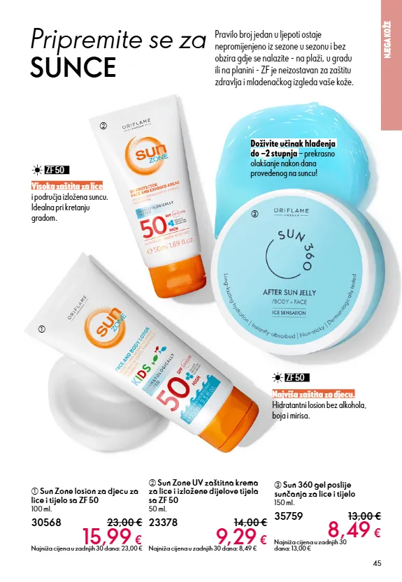 section name 45 njega kože najviša zaštita za djecu. hidratantni losion bez alkohola, boja i mirisa. visoka zaštita za lice i područja izložena suncu. idealna pri kretanju gradom. doživite učinak hlađenja do -2 stupnja – prekrasno olakšanje nakon dana provedenog na suncu! zf 50 zf 50 a sun zone losion za djecu za lice i tijelo sa zf 50 100 ml. 30568 23,00 € 15,99 € najniža cijena u zadnjih 30 dana: 23,00 € b sun zone uv zaštitna krema za lice i izložene dijelove tijela sa zf 50 50 ml. 23378 14,00 € 9,29 € najniža cijena u zadnjih 30 dana: 8,49 € c sun 360 gel poslije sunčanja za lice i tijelo 150 ml. 35759 13,00 € 8,49 € najniža cijena u zadnjih 30 dana: 13,00 € pripremite se za sunce pravilo broj jedan u ljepoti ostaje nepromijenjeno iz sezone u sezonu i bez obzira gdje se nalazite - na plaži, u gradu ili na planini - zf je neizostavan za zaštitu zdravlja i mladenačkog izgleda vaše kože. a b c