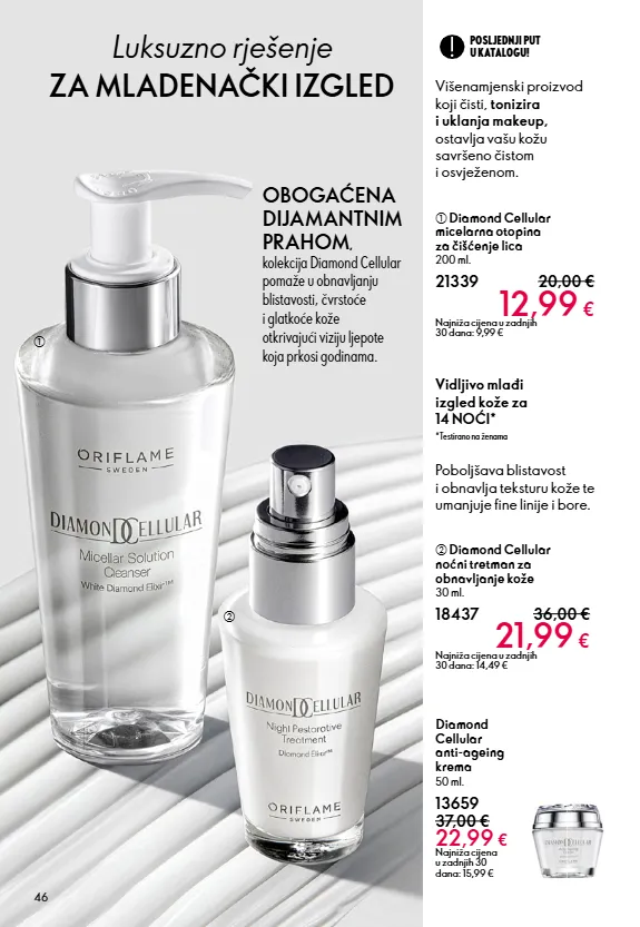 POSLJEDNJI PUT U KATALOGU! 46 Diamond Cellular anti-ageing krema 50 ml. 13659 37,00 € 22,99 € Najniža cijena u zadnjih 30 dana: 15,99 € Višenamjenski proizvod koji čisti, tonizira i uklanja makeup, ostavlja vašu kožu savršeno čistom i osvježenom. Poboljšava blistavost i obnavlja teksturu kože te umanjuje fine linije i bore. *Testirano na ženama Vidljivo mlađi izgled kože za 14 NOĆI* OBOGAĆENA DIJAMANTNIM PRAHOM , kolekcija Diamond Cellular pomaže u obnavljanju blistavosti, čvrstoće i glatkoće kože otkrivajući viziju ljepote koja prkosi godinama. b Diamond Cellular noćni tretman za obnavljanje kože 30 ml. 18437 36,00 € 21,99 € Najniža cijena u zadnjih 30 dana: 14,49 € a Diamond Cellular micelarna otopina za čišćenje lica 200 ml. 21339 20,00 € 12,99 € Najniža cijena u zadnjih 30 dana: 9,99 € Luksuzno rješenje ZA MLADENAČKI IZGLED a b