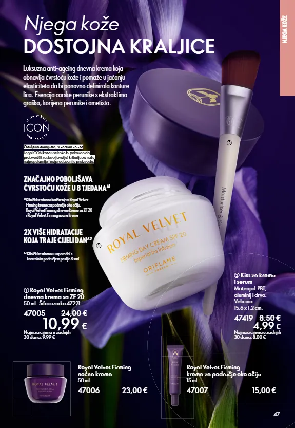 47 Logo ICON koristi se kako bi pokazao da proizvod(i) zadovoljava(ju) kriterije za naše najpopularnije i najprodavanije proizvode. Omiljeno mnogima, stvoreno za vas Royal Velvet Firming krema za područje oko očiju 15 ml. 47007 15,00 Royal Velvet Firming noćna krema 50 ml. 47006 23,00 € a Royal Velvet Firming dnevna krema sa ZF 20 50 ml. Šifra uzorka 47221. 47005 24,00 € 10,99 € Najniža cijena u zadnjih 30 dana: 9,99 € b Kist za kremu i serum Materijal: PBT, aluminij i drvo. Veličina: 15,6 x 1,2 cm. 47419 8,50 € 4,99 € Najniža cijena u zadnjih 30 dana: 8,00 € Luksuzna anti-ageing dnevna krema koja obnavlja čvrstoću kože i pomaže u jačanju elasticiteta da bi ponovno definirala konture lica. Esencija carske perunike s ekstraktima graška, korijena perunike i ametista. 2X VIŠE HIDRATACIJE KOJA TRAJE CIJELI DAN ∆2 ZNAČAJNO POBOLJŠAVA ČVRSTOĆU KOŽE U 8 TJEDANA ∆1 Njega kože DOSTOJNA KRALJICE NJEGA KOŽE ∆1 Klinički testirano korištenjem Royal Velvet Firming kreme za područje oko očiju, Royal Velvet Firming dnevne kreme sa ZF 20 i Royal Velvet Firming noćne kreme ∆2 Klinički testirano u usporedbi s kontrolnim područjem poslije 8 sati a b