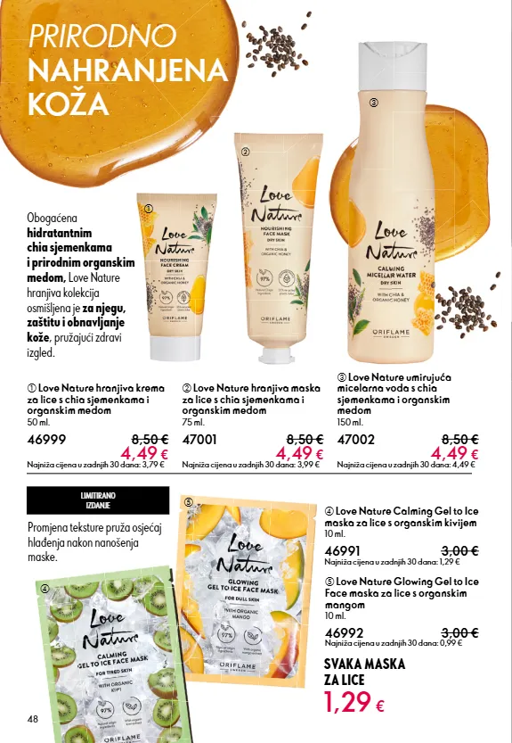 a b c d e b b 48 a love nature hranjiva krema za lice s chia sjemenkama i organskim medom 50 ml. 46999 8,50 € 4,49 € najniža cijena u zadnjih 30 dana: 3,79 € c love nature umirujuća micelarna voda s chia sjemenkama i organskim medom 150 ml. 47002 8,50 € 4,49 € najniža cijena u zadnjih 30 dana: 4,49 € prirodno nahranjena koža d love nature calming gel to ice maska za lice s organskim kivijem 10 ml. 46991 3,00 € najniža cijena u zadnjih 30 dana: 1,29 € e love nature glowing gel to ice face maska za lice s organskim mangom 10 ml. 46992 3,00 € najniža cijena u zadnjih 30 dana: 0,99 € 1,29 € obogaćena hidratantnim chia sjemenkama i prirodnim organskim medom, love nature hranjiva kolekcija osmišljena je za njegu, zaštitu i obnavljanje kože , pružajući zdravi izgled. promjena teksture pruža osjećaj hlađenja nakon nanošenja maske. svaka maska za lice limitirano izdanje b love nature hranjiva maska za lice s chia sjemenkama i organskim medom 75 ml. 47001 8,50 € 4,49 € najniža cijena u zadnjih 30 dana: 3,99 €