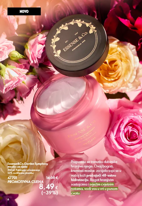 6 essense&co.garden symphony maslac za tijelo 250 ml. pakiranje od najmanje 50% reciklirane plastike. 47701 14,00 € promotivna cijena 8,49 € (–39%) novo prepustite se trenutku dubinske hranjive njege. ovaj bogati, kremasti maslac za tijelo topi se u vašoj koži pružajući 48-satnu hidrataciju. bogat hranjivim sastojcima i svježim cvjetnim notama, vodi vas u vrt u punom cvatu.