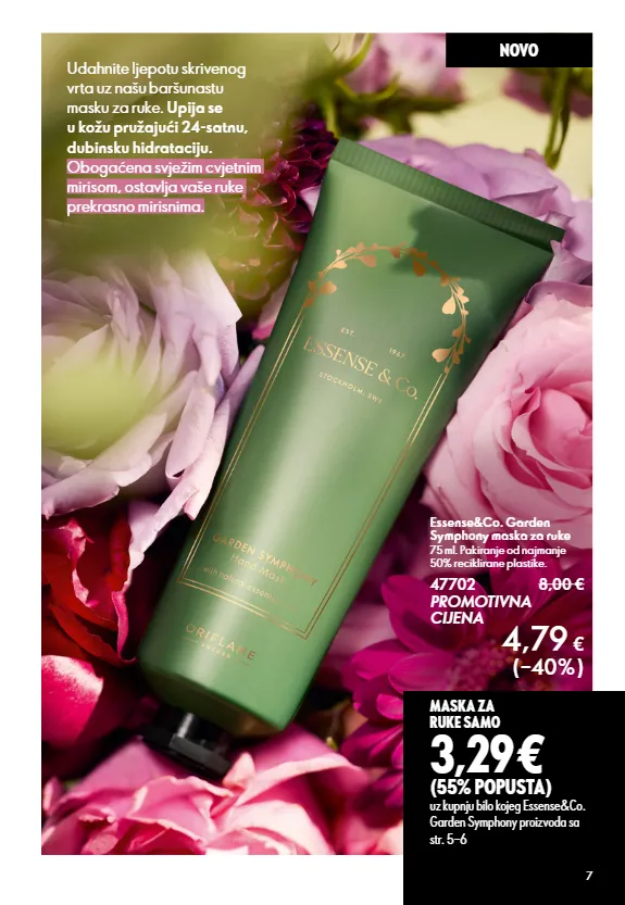 7 Essense&Co. Garden Symphony maska za ruke 75 ml. Pakiranje od najmanje 50% reciklirane plastike. 47702 8,00 € PROMOTIVNA CIJENA 4,79 € (–40%) NOVO Udahnite ljepotu skrivenog vrta uz našu baršunastu masku za ruke. Upija se u kožu pružajući 24-satnu, dubinsku hidrataciju. Obogaćena svježim cvjetnim mirisom, ostavlja vaše ruke prekrasno mirisnima. MASKA ZA RUKE SAMO 3,29€ (55% POPUSTA) uz kupnju bilo kojeg Essense&Co. Garden Symphony proizvoda sa str. 5−6