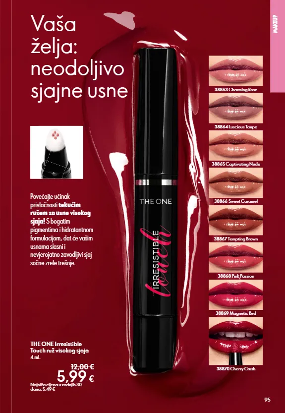 23 The ONE Smart Sync ruž za usne 3,8 g. 12,00 € 5,49 € Najniža cijena u zadnjih 30 dana: 5,49 € 46446 Deep Berry 46447 Smart Red 46440 Delicate Rose 46441 Creamy Rosewood 46442 Soft Magenta 46444 Burnt Sienna 46445 Double Espresso 46437 Warm Cocoa 46436 Golden Caramel 46443 Marvellous Mocha 46448 Stylish Brick 46449 Cherry Plum 46439 Pinkish Mauve 46439 Pinkish Mauve 46438 Baked Terracotta 46435 Blushing Nude ROĐENDANSKE PONUDE Obavijete usne satenskim sjajem