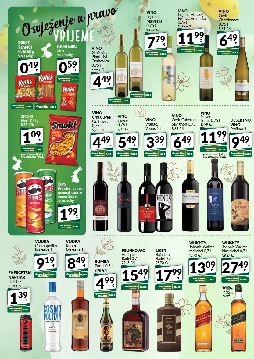 osvježenje u pravo vrijeme vino graševina, pinot sivi orahovica 0,75 l 5,99 €/l 4 49 € cijena na datum 02.05.2025. 7,02 € cijena na datum 02.05.2025. 8,39 € pelinkovac antique badel 0,7 l 22,13 €/l 15 49 € cijena na datum 02.05.2025. 18,02 € whiskey johnnie walker red label 0,7 l 18,70 €/l 13 09 € cijena na datum 02.05.2025. 21,49 € vino laguna malvazija festigia vrhunsko 0,75 l 15,99 €/l 11 99 € cijena na datum 02.05.2025. 15,02 € 0 49 € ribice, štapići kviki 50 g 9,80 €/kg cijena na datum 02.05.2025. 0,79 € cijena na datum 02.05.2025. 0,85 € 0 59 € kviki gric 50 g 11,80 €/kg cijena na datum 02.05.2025. 1,07 € energetski napitak hell 0,5 l 2,78 €/l 1 39 € cijena na datum 02.05.2025. 1,69 € rumba badel 0,5 l 9,98 €/l 4 99 € cijena na datum 02.05.2025. 8,38 € vodka cosmopolitan maraska 1 l 9 19 € cijena na datum 02.05.2025. 12,29 € vodka room maraska 1 l 8 49 € cijena na datum 02.05.2025. 11,52 € vino cuvée 0,75 l 7,32 €/l 5 49 € cijena na datum 02.05.2025. 7,30 € vino cavit cabernet savignon 0,75 l 8,65 €/l 6 49 € cijena na datum 02.05.2025. 9,23 € * ponuda ne vrijedi za sva prodajna mjesta vino laguna malvazija 0,75 l 10,39 €/l 7 79 € cijena na datum 02.05.2025. 9,92 € vino vranac, venus 1 l 3 39 € cijena na datum 02.05.2025. 4,62 € liker bajadera badel 0,7 l 25,70 €/l 17 99 € cijena na datum 02.05.2025. 23,93 € whiskey johnnie walker black label 0,7 l 39,27 €/l 27 49 € cijena na datum 02.05.2025. 39,29 € 1 99 € čips pringles paprika, original, sour & onion 165 g 12,06 €/kg cijena na datum 02.05.2025. 4,14 € * ponuda ne vrijedi za sva prodajna mjesta 1 09 € smoki flips 130 g 8,38 €/kg cijena na datum 02.05.2025. 1,49 € vino cavit chardonnay 0,75 l 8,65 €/l 6 49 € cijena na datum 02.05.2025. 9,39 € desertno vino prošper 1 l 9 49 € cijena na datum 02.05.2025. 11,82 € vino crni cuvée orahovica 0,75 l 5,99 €/l 4 49 € cijena na datum 02.05.2025. 7,49 € vino plavac tomić 0,75 l 15,99 €/l 11 99 € cijena na datum 02.05.2025. 14,79 € * ponuda ne vrijedi za sva prodajna mjesta