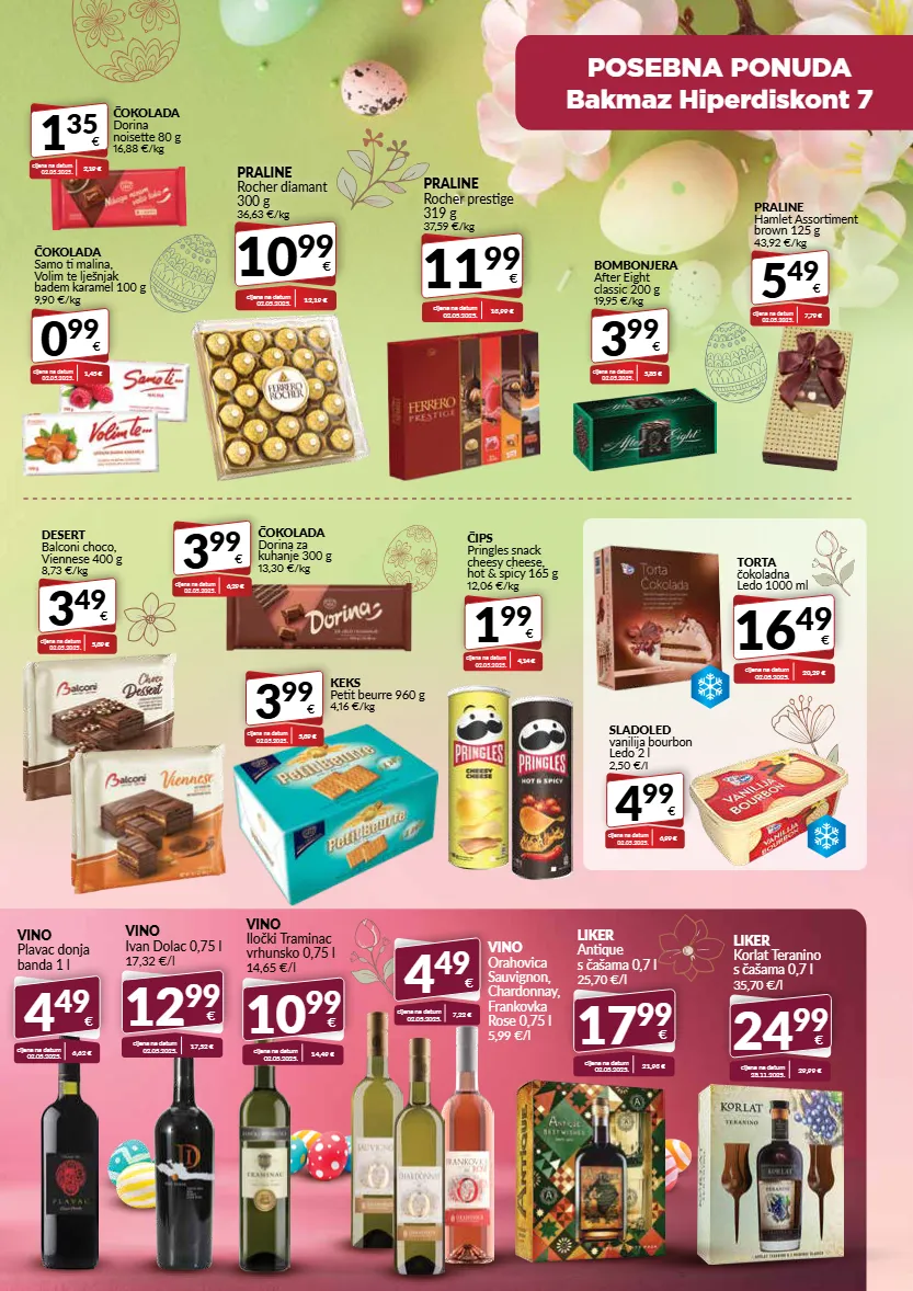 10 99 € cijena na datum 02.05.2025. 12,19 € praline rocher diamant 300 g 36,63 €/kg 11 99 € cijena na datum 02.05.2025. 13,99 € praline rocher prestige 319 g 37,59 €/kg 0 99 € čokolada samo ti malina, volim te lješnjak badem karamel 100 g 9,90 €/kg cijena na datum 02.05.2025. 1,45 € 3 99 € bombonjera after eight classic 200 g 19,95 €/kg cijena na datum 02.05.2025. 5,85 € 1 99 € čips pringles snack cheesy cheese, hot & spicy 165 g 12,06 €/kg cijena na datum 02.05.2025. 4,14 € 3 99 € keks petit beurre 960 g 4,16 €/kg cijena na datum 02.05.2025. 5,39 € 24 99 € liker korlat teranino s čašama 0,7 l 35,70 €/l cijena na datum 28.11.2025. 29,99 € posebna ponuda bakmaz hiperdiskont 7 12 99 € vino ivan dolac 0,75 l 17,32 €/l cijena na datum 02.05.2025. 17,52 € 4 49 € vino plavac donja banda 1 l cijena na datum 02.05.2025. 6,62 € 17 99 € liker antique s čašama 0,7 l 25,70 €/l cijena na datum 02.05.2025. 21,93 € 10 99 € vino iločki traminac vrhunsko 0,75 l 14,65 €/l cijena na datum 02.05.2025. 14,49 € 5 49 € praline hamlet assortiment brown 125 g 43,92 €/kg cijena na datum 02.05.2025. 7,79 € 4 49 € vino orahovica sauvignon, chardonnay, frankovka rose 0,75 l 5,99 €/l cijena na datum 02.05.2025. 7,22 € 3 99 € čokolada dorina za kuhanje 300 g 13,30 €/kg cijena na datum 02.05.2025. 6,29 € 4 99 € sladoled vanilija bourbon ledo 2 l 2,50 €/l cijena na datum 02.05.2025. 6,99 € 16 49 € cijena na datum 02.05.2025. 20,29 € torta čokoladna ledo 1000 ml 3 49 € desert balconi choco, viennese 400 g 8,73 €/kg cijena na datum 02.05.2025. 5,39 € 1 35 € čokolada dorina noisette 80 g 16,88 €/kg cijena na datum 02.05.2025. 2,19 €