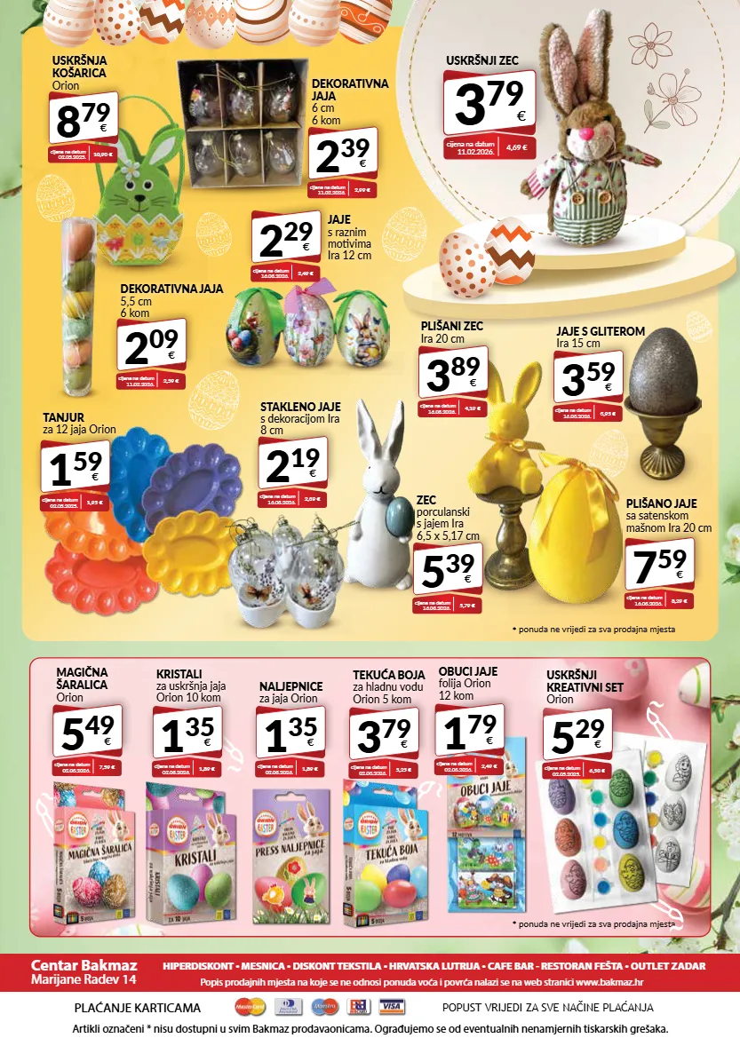 PLAĆANJE KARTICAMA Artikli označeni * nisu dostupni u svim Bakmaz prodavaonicama. Ograđujemo se od eventualnih nenamjernih tiskarskih grešaka. POPUST VRIJEDI ZA SVE NAČINE PLAĆANJA Centar Bakmaz Marijane Radev 14 HIPERDISKONT • MESNICA • DISKONT TEKSTILA • HRVATSKA LUTRIJA • CAFE BAR - RESTORAN FEŠTA • OUTLET ZADAR Popis prodajnih mjesta na koje se ne odnosi ponuda voća i povrća nalazi se na web stranici www.bakmaz.hr * ponuda ne vrijedi za sva prodajna mjesta * ponuda ne vrijedi za sva prodajna mjesta 3 79 € TEKUĆA BOJA za hladnu vodu Orion 5 kom cijena na datum 02.03.2026. 5,25 € 2 19 € STAKLENO JAJE s dekoracijom Ira 8 cm cijena na datum 16.03.2026. 2,39 € 1 59 € TANJUR za 12 jaja Orion cijena na datum 02.05.2025. 1,95 € USKRŠNJI ZEC 3 79 € cijena na datum 11.02.2026. 4,69 € 3 59 € JAJE S GLITEROM Ira 15 cm cijena na datum 16.03.2026. 3,95 € 2 29 € JAJE s raznim motivima Ira 12 cm cijena na datum 16.03.2026. 2,49 € 2 39 € DEKORATIVNA JAJA 6 cm 6 kom cijena na datum 11.02.2026. 2,99 € 8 79 € USKRŠNJA KOŠARICA Orion cijena na datum 02.05.2025. 10,90 € 2 09 € DEKORATIVNA JAJA 5,5 cm 6 kom cijena na datum 11.02.2026. 2,59 € 1 35 € KRISTALI za uskršnja jaja Orion 10 kom cijena na datum 02.03.2026. 1,89 € 1 35 € NALJEPNICE za jaja Orion cijena na datum 02.03.2026. 1,89 € 5 29 € USKRŠNJI KREATIVNI SET Orion cijena na datum 02.05.2025. 6,50 € 1 79 € OBUCI JAJE folija Orion 12 kom cijena na datum 02.03.2026. 2,49 € 5 49 € MAGIČNA ŠARALICA Orion cijena na datum 02.03.2026. 7,59 € 3 89 € PLIŠANI ZEC Ira 20 cm cijena na datum 16.03.2026. 4,19 € 7 59 € PLIŠANO JAJE sa satenskom mašnom Ira 20 cm cijena na datum 16.03.2026. 8,29 € 5 39 € ZEC porculanski s jajem Ira 6,5 x 5,17 cm cijena na datum 16.03.2026. 5,79 €