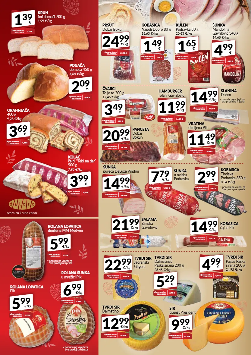 3 49 € čvarci to je to 200 g 17,45 €/kg cijena na datum 02.05.2025. 4,25 € 1 65 € kulen podravka 80 g 20,63 €/kg cijena na datum 02.05.2025. 2,49 € 4 99 € šunka mandolina gavrilović 340 g 14,68 €/kg cijena na datum 02.05.2025. 6,95 € 3 99 € kolač čajni “tebi na dar” 500 g 7,98 €/kg cijena na datum 02.05.2025. 5,30 € 4 99 € tvrdi sir pagus paška sirana 200 g 24,95 €/kg cijena na datum 02.05.2025. 5,49 € 14 99 €/kg šunka pureća deluxe vindon cijena na datum 02.05.2025. 19,85 € 24 99 €/kg pršut dobar bokun cijena na datum 02.05.2025. 29,90 € 20 99 €/kg panceta dobar bokun cijena na datum 02.05.2025. 24,24 € 11 99 €/kg hamburger rolani gavrilović cijena na datum 02.05.2025. 16,87 € 14 99 €/kg kobasica čajna pik cijena na datum 02.05.2025. 19,97 € 21 99 €/kg salama zimska gavrilović cijena na datum 02.05.2025. 27,97 € 12 99 €/kg tvrdi sir dalmatino cijena na datum 02.05.2025. 16,90 € 5 99 €/kg rolana lopatica dimljena mm medven cijena na datum 02.05.2025. 8,99 € * ponuda ne vrijedi za sva prodajna mjesta 2 99 € kobasica tirolska podravka 350 g 8,54 €/kg cijena na datum 02.05.2025. 3,91 € 7 79 €/kg šunka u ovitku podravka cijena na datum 02.05.2025. 13,29 € 14 99 €/kg slanina dobro cijena na datum 02.05.2025. 27,89 € * ponuda ne vrijedi za sva prodajna mjesta 2 09 € pogača domaća 450 g 4,64 €/kg cijena na datum 02.05.2025. 2,95 € 3 69 € orahnjača 400 g 9,23 €/kg cijena na datum 02.05.2025. 4,63 € 1 39 € kruh fini domaći 700 g 1,99 €/kg cijena na datum 02.05.2025. 1,72 € 6 99 €/kg rolana šunka u mrežici pik cijena na datum 02.05.2025. 9,99 € 5 99 €/kg rolana lopatica pik cijena na datum 02.05.2025. 7,99 € 1 49 € kobasica napoli dobro 80 g 18,63 €/kg cijena na datum 02.05.2025. 1,86 € 5 29 € tvrdi sir dalmatinac paška sirana 200 g 26,45 €/kg cijena na datum 02.05.2025. 5,79 € 9 99 €/kg sir trapist président cijena na datum 02.05.2025. 13,59 € 22 99 €/kg tvrdi sir jadranski gligora cijena na datum 02.05.2025. 29,49 € 11 49 €/kg vratina dimljena pik cijena na datum 02.05.2025. 14,49 € ntl robna marka * ponuda ne vrijedi za sva prodajna mjesta * ponuda ne vrijedi za sva prodajna mjesta