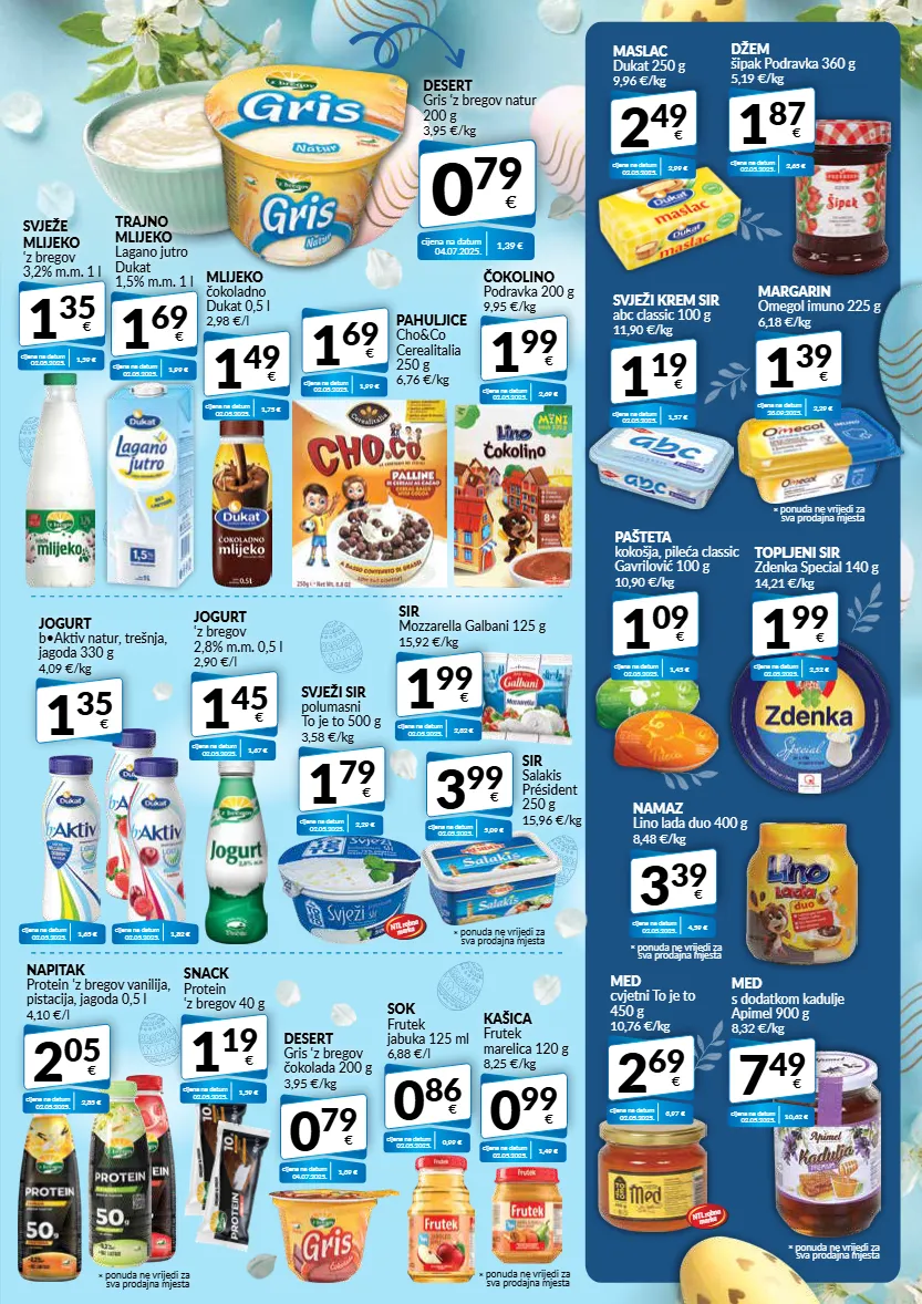 1 69 € pahuljice cho&co cerealitalia 250 g 6,76 €/kg cijena na datum 02.05.2025. 1,99 € 1 99 € čokolino podravka 200 g 9,95 €/kg cijena na datum 02.05.2025. 2,69 € 1 09 € pašteta kokošja, pileća classic gavrilović 100 g 10,90 €/kg cijena na datum 02.05.2025. 1,45 € 2 05 € napitak protein ‘z bregov vanilija, pistacija, jagoda 0,5 l 4,10 €/l cijena na datum 02.05.2025. 2,85 € 0 79 € desert gris ‘z bregov čokolada 200 g 3,95 €/kg cijena na datum 04.07.2025. 1,39 € 0 99 € kašica frutek marelica 120 g 8,25 €/kg cijena na datum 02.05.2025. 1,49 € 0 86 € sok frutek jabuka 125 ml 6,88 €/l cijena na datum 02.05.2025. 0,99 € * ponuda ne vrijedi za sva prodajna mjesta 1 39 € margarin omegol imuno 225 g 6,18 €/kg cijena na datum 23.09.2025. 2,29 € * ponuda ne vrijedi za sva prodajna mjesta * ponuda ne vrijedi za sva prodajna mjesta cijena na datum 02.05.2025. 1,82 € 1 99 € sir mozzarella galbani 125 g 15,92 €/kg cijena na datum 02.05.2025. 2,32 € 1 99 € topljeni sir zdenka special 140 g 14,21 €/kg cijena na datum 02.05.2025. 2,52 € 3 39 € namaz lino lada duo 400 g 8,48 €/kg cijena na datum 02.05.2025. 4,59 € * ponuda ne vrijedi za sva prodajna mjesta 1 19 € svježi krem sir abc classic 100 g 11,90 €/kg cijena na datum 02.05.2025. 1,57 € 1 87 € džem šipak podravka 360 g 5,19 €/kg cijena na datum 02.05.2025. 2,65 € 2 69 € med cvjetni to je to 450 g 10,76 €/kg cijena na datum 02.05.2025. 3,97 € 7 49 € med s dodatkom kadulje apimel 900 g 8,32 €/kg cijena na datum 02.05.2025. 10,62 € desert gris ‘z bregov natur 200 g 3,95 €/kg 0 79 € cijena na datum 04.07.2025. 1,39 € 2 49 € maslac dukat 250 g 9,96 €/kg cijena na datum 02.05.2025. 2,99 € 1 69 € trajno mlijeko lagano jutro dukat 1,5% m.m. 1 l cijena na datum 02.05.2025. 1,99 € 1 35 € jogurt b•aktiv natur, trešnja, jagoda 330 g 4,09 €/kg cijena na datum 02.05.2025. 1,65 € * ponuda ne vrijedi za sva prodajna mjesta 3 99 € sir salakis président 250 g 15,96 €/kg cijena na datum 02.05.2025. 5,09 € 1 19 € snack protein ‘z bregov 40 g cijena na datum 02.05.2025. 1,59 € 1 45 € jogurt ‘z bregov 2,8% m.m. 0,5 l 2,90 €/l cijena na datum 02.05.2025. 1,67 € 1 79 € svježi sir polumasni to je to 500 g 3,58 €/kg cijena na datum 02.05.2025. 2,29 € ntl robna marka ntl robna marka * ponuda ne vrijedi za sva prodajna mjesta 1 49 € mlijeko čokoladno dukat 0,5 l 2,98 €/l cijena na datum 02.05.2025. 1,75 € 1 35 € svježe mlijeko ‘z bregov 3,2% m.m. 1 l cijena na datum 02.05.2025. 1,59 €
