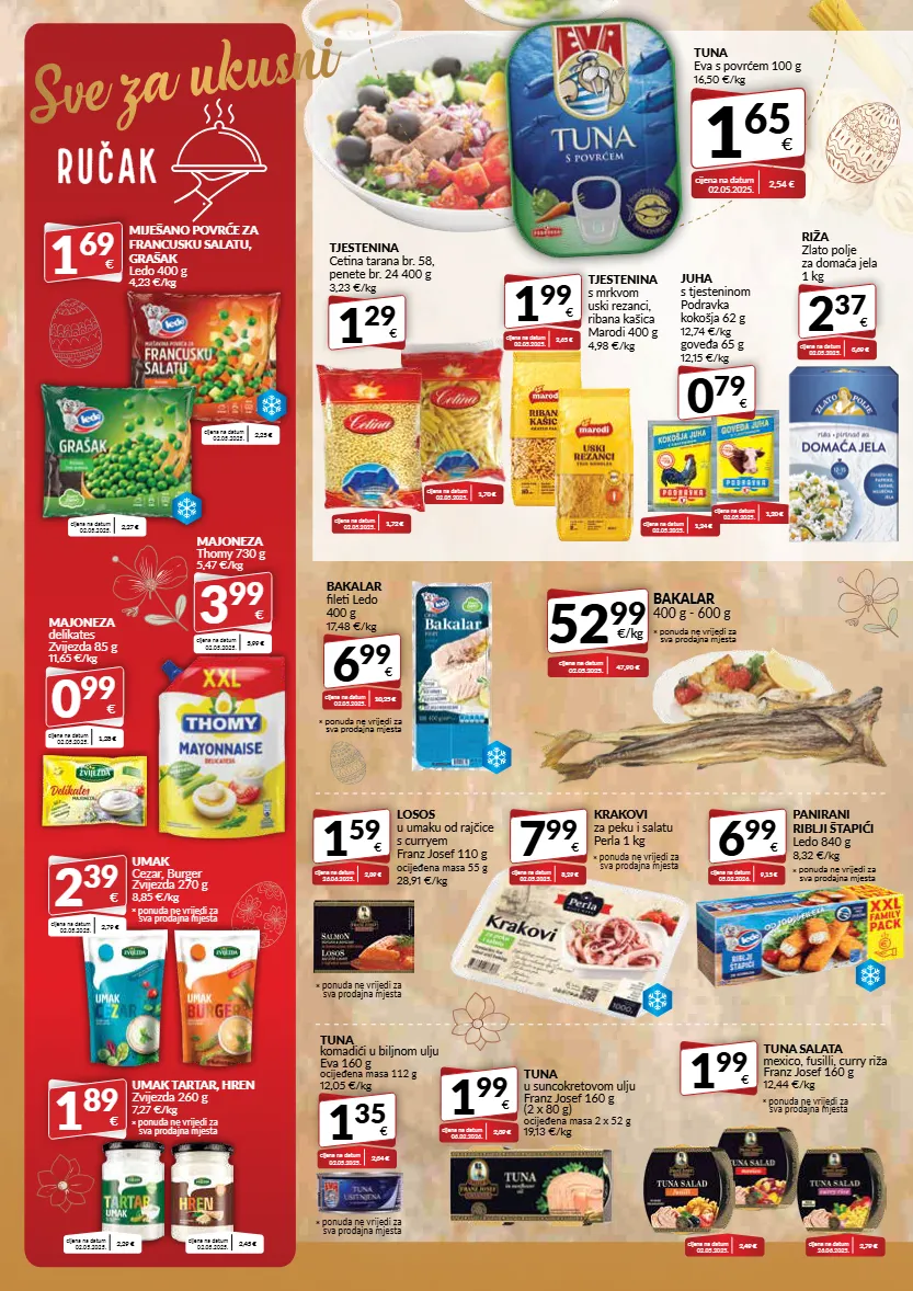 sve za ukusni ručak 1 29 € tjestenina cetina tarana br. 58, penete br. 24 400 g 3,23 €/kg cijena na datum 02.05.2025. 1,72 € cijena na datum 02.05.2025. 1,70 € tuna eva s povrćem 100 g 16,50 €/kg 1 65 € cijena na datum 02.05.2025. 2,54 € umak tartar, hren zvijezda 260 g 7,27 €/kg 1 89 € * ponuda ne vrijedi za sva prodajna mjesta cijena na datum 02.05.2025. 2,29 € cijena na datum 02.05.2025. 2,45 € miješano povrće za francusku salatu, grašak ledo 400 g 4,23 €/kg 1 69 € cijena na datum 02.05.2025. 2,25 € cijena na datum 02.05.2025. 2,27 € majoneza thomy 730 g 5,47 €/kg 3 99 € cijena na datum 02.05.2025. 5,99 € majoneza delikates zvijezda 85 g 11,65 €/kg 0 99 € cijena na datum 02.05.2025. 1,28 € 1 35 € tuna komadići u biljnom ulju eva 160 g ocijeđena masa 112 g 12,05 €/kg cijena na datum 02.05.2025. 2,34 € * ponuda ne vrijedi za sva prodajna mjesta 1 99 € tuna u suncokretovom ulju franz josef 160 g (2 x 80 g) ocijeđena masa 2 x 52 g 19,13 €/kg cijena na datum 06.02.2026. 2,39 € 1 99 € tuna salata mexico, fusilli, curry riža franz josef 160 g 12,44 €/kg cijena na datum 02.05.2025. 2,49 € cijena na datum 26.06.2025. 2,79 € * ponuda ne vrijedi za sva prodajna mjesta 1 99 € tjestenina s mrkvom uski rezanci, ribana kašica marodi 400 g 4,98 €/kg cijena na datum 02.05.2025. 2,65 € 0 79 € juha s tjesteninom podravka kokošja 62 g 12,74 €/kg goveđa 65 g 12,15 €/kg cijena na datum 02.05.2025. 1,24 € cijena na datum 02.05.2025. 1,20 € 2 37 € riža zlato polje za domaća jela 1 kg cijena na datum 02.05.2025. 3,69 € 6 99 € bakalar fileti ledo 400 g 17,48 €/kg cijena na datum 02.05.2025. 10,25 € * ponuda ne vrijedi za sva prodajna mjesta 1 59 € losos u umaku od rajčice s curryem franz josef 110 g ocijeđena masa 55 g 28,91 €/kg cijena na datum 26.06.2025. 2,09 € 6 99 € panirani riblji štapići ledo 840 g 8,32 €/kg cijena na datum 0 5.02.2026. 9,15 € * ponuda ne vrijedi za sva prodajna mjesta umak cezar, burger zvijezda 270 g 8,85 €/kg 2 39 € cijena na datum 02.05.2025. 2,79 € * ponuda ne vrijedi za sva prodajna mjesta * ponuda ne vrijedi za sva prodajna mjesta 7 99 € krakovi za peku i salatu perla 1 kg cijena na datum 0 2.05.2025. 8,29 € 52 99 €/kg cijena na datum 02.05.2025. 47,90 € bakalar 400 g - 600 g * ponuda ne vrijedi za sva prodajna mjesta * ponuda ne vrijedi za sva prodajna mjesta