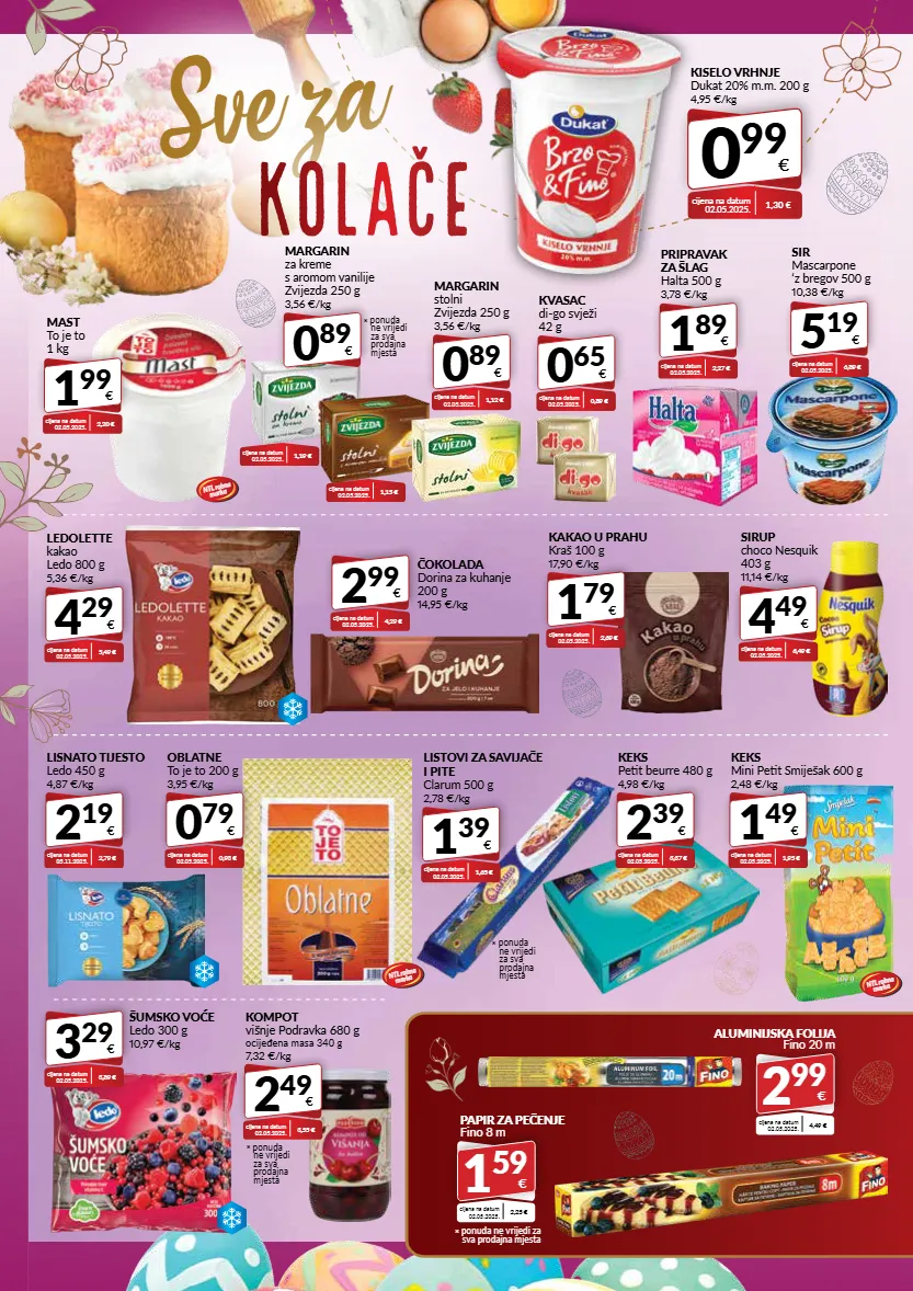 kiselo vrhnje dukat 20% m.m. 200 g 4,95 €/kg 0 99 € cijena na datum 02.05.2025. 1,30 € sve za 1 99 € mast to je to 1 kg cijena na datum 02.05.2025. 2,20 € cijena na datum 02.05.2025. 1,15 € 4 29 € ledolette kakao ledo 800 g 5,36 €/kg cijena na datum 02.05.2025. 5,49 € 2 19 € lisnato tijesto ledo 450 g 4,87 €/kg cijena na datum 05.11.2025. 2,79 € 3 29 € šumsko voće ledo 300 g 10,97 €/kg cijena na datum 02.05.2025. 3,89 € 0 79 € oblatne to je to 200 g 3,95 €/kg cijena na datum 02.05.2025. 0,93 € 1 79 € kakao u prahu kraš 100 g 17,90 €/kg cijena na datum 02.05.2025. 2,69 € 4 49 € sirup choco nesquik 403 g 11,14 €/kg cijena na datum 02.05.2025. 6,49 € 2 99 € čokolada dorina za kuhanje 200 g 14,95 €/kg cijena na datum 02.05.2025. 4,29 € 1 89 € pripravak za šlag halta 500 g 3,78 €/kg cijena na datum 02.05.2025. 2,27 € 5 19 € sir mascarpone ‘z bregov 500 g 10,38 €/kg cijena na datum 02.05.2025. 6,89 € 0 65 € kvasac di-go svježi 42 g cijena na datum 02.05.2025. 0,89 € 2 49 € kompot višnje podravka 680 g ocijeđena masa 340 g 7,32 €/kg cijena na datum 02.05.2025. 3,55 € * ponuda ne vrijedi za sva prodajna mjesta 1 39 € listovi za savijače i pite clarum 500 g 2,78 €/kg cijena na datum 02.05.2025. 1,65 € * ponuda ne vrijedi za sva prodajna mjesta 2 39 € keks petit beurre 480 g 4,98 €/kg cijena na datum 02.05.2025. 3,37 € aluminijska folija fino 20 m 2 99 € cijena na datum 02.05.2025. 4,49 € papir za pečenje fino 8 m 1 59 € cijena na datum 02.05.2025. 2,25 € * ponuda ne vrijedi za sva prodajna mjesta 1 49 € keks mini petit smiješak 600 g 2,48 €/kg cijena na datum 02.05.2025. 1,95 € kolače 0 89 € margarin stolni zvijezda 250 g 3,56 €/kg cijena na datum 02.05.2025. 1,12 € ntl robna marka ntl robna marka ntl robna marka cijena na datum 02.05.2025. 1,19 € 0 89 € margarin za kreme s aromom vanilije zvijezda 250 g 3,56 €/kg * ponuda ne vrijedi za sva prodajna mjesta
