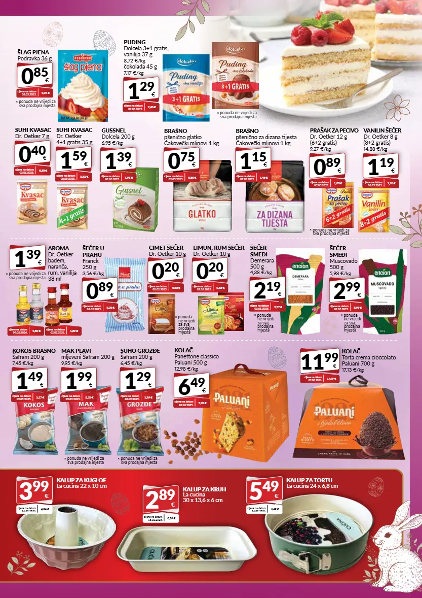 1 29 € puding dolcela 3+1 gratis, vanilija 37 g 8,72 €/kg čokolada 45 g 7,17 €/kg cijena na datum 02.05.2025. 2,40 € 0 40 € suhi kvasac dr. oetker 7 g cijena na datum 02.05.2025. 0,58 € 1 59 € suhi kvasac dr. oetker 4+1 gratis 35 g cijena na datum 02.05.2025. 2,32 € 0 85 € šlag pjena podravka 36 g cijena na datum 02.05.2025. 1,24 € * ponuda ne vrijedi za sva prodajna mjesta * ponuda ne vrijedi za sva prodajna mjesta 0 89 € prašak za pecivo dr. oetker 12 g (6+2 gratis) 9,27 €/kg cijena na datum 02.05.2025. 1,38 € 1 39 € gussnel dolcela 200 g 6,95 €/kg cijena na datum 02.05.2025. 1,93 € 1 19 € vanilin šećer dr. oetker 8 g (8+2 gratis) 14,88 €/kg cijena na datum 02.05.2025. 1,76 € 0 75 € brašno pšenično glatko čakovečki mlinovi 1 kg cijena na datum 02.05.2025. 0,80 € 1 15 € brašno pšenično za dizana tijesta čakovečki mlinovi 1 kg cijena na datum 02.05.2025. 1,46 € 0 89 € šećer u prahu franck 250 g 3,56 €/kg cijena na datum 02.05.2025. 1,01 € 2 19 € šećer smeđi demerara 500 g 4,38 €/kg cijena na datum 02.05.2025. 2,77 € 2 99 € šećer smeđi muscovado 500 g 5,98 €/kg cijena na datum 02.05.2025. 3,95 € 1 49 € kokos brašno šafram 200 g 7,45 €/kg cijena na datum 02.05.2025. 1,27 € 1 99 € mak plavi mljeveni šafram 200 g 9,95 €/kg cijena na datum 02.05.2025. 2,52 € kalup za kruh la cucina 30 x 13,6 x 6 cm 2 89 € cijena na datum 16.02.2026. 3,29 € kalup za kuglof la cucina 22 x 10 cm 3 99 € cijena na datum 16.02.2026. 4,94 € kolač torta crema cioccolato paluani 700 g 17,13 €/kg 11 99 € cijena na datum 02.03.2026. 14,99 € * ponuda ne vrijedi za sva prodajna mjesta * ponuda ne vrijedi za sva prodajna mjesta 1 39 € aroma dr. oetker badem, naranča, rum, vanilija 38 ml cijena na datum 02.05.2025. 1,89 € * ponuda ne vrijedi za sva prodajna mjesta cijena na datum 09.02.2026. 1,89 € 0 20 € limun, rum šećer dr. oetker 10 g cijena na datum 02.05.2025. 0,38 € 0 20 € cimet šećer dr. oetker 10 g cijena na datum 02.05.2025. 0,38 € * ponuda ne vrijedi za sva prodajna mjesta 1 29 € suho grožđe šafram 200 g 6,45 €/kg cijena na datum 02.05.2025. 1,19 € 6 49 € kolač panettone classico paluani 500 g 12,98 €/kg cijena na datum 20.10.2025. 7,70 € kalup za tortu la cucina 24 x 6,8 cm 5 49 € cijena na datum 16.02.2026. 6,49 € * ponuda ne vrijedi za sva prodajna mjesta * ponuda ne vrijedi za sva prodajna mjesta * ponuda ne vrijedi za sva prodajna mjesta