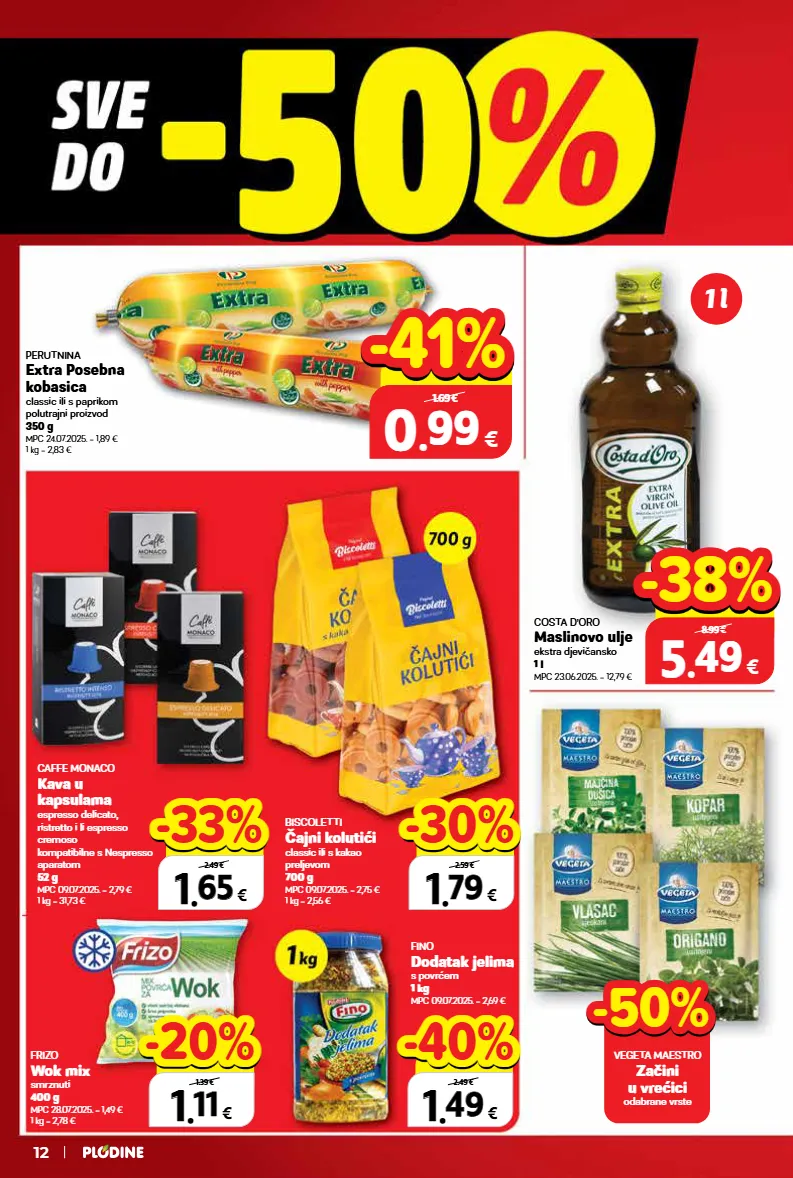 perutnina extra posebna kobasica classic ili s paprikom polutrajni proizvod 350 g mpc 24.07.2025. = 1,89 € 1 kg = 2,83 € frizo wok mix smrznuti 400 g mpc 28.07.2025. = 1,49 € 1 kg = 2,78 € fino dodatak jelima s povrćem 1 kg mpc 09.07.2025. = 2,69 € vegeta maestro začini u vrećici odabrane vrste -50% -50% biscoletti čajni kolutići classic ili s kakao preljevom 700 g mpc 09.07.2025. = 2,75 € 1 kg = 2,56 € 1 1 . . 11 11 € xxxxx 1.39 € -20% -20% 1 1 . . 79 79 € xxxxx 2.59 € -30% -30% 1 1 . . 65 65 € xxxxx 2.49 € -33% -33% 1 1 . . 49 49 € xxxxx 2.49 € -40% -40% 0 0 . . 99 99 € 350 g 1.69 € -41% -41% caffe monaco kava u kapsulama espresso delicato, ristretto i li espresso cremoso kompatibilne s nespresso aparatom 52 g mpc 09.07.2025. = 2,79 € 1 kg = 31,73 € costa d’oro maslinovo ulje ekstra djevičansko 1 l mpc 23.06.2025. = 12,79 € 5 5 . . 49 49 € 1 l 8.99 € -38% -38% 1 l 12
