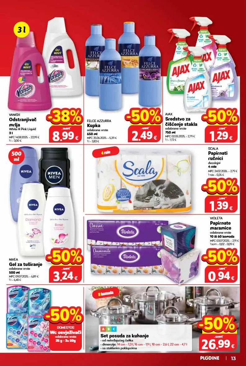 violeta papirnate maramice odabrane vrste 10 ili 60 komada mpc 03.07.2025. = 2,19 € 1 kom = 0,02 - 0,09 € 0 0 . . 94 94 € 10 ili 60 komada 1.89 € -50% -50% vanish odstranjivač mrlja white ili pink liquid 3 l mpc 14.08.2025. = 22,99 € 1 l = 3,00 € 8 8 . . 99 99 € 3 l 14.69 € -38% -38% ajax sredstvo za čišćenje stakla odabrane vrste 750 ml mpc 02.05.2025. = 2,79 € 1 l = 1,72 € 1 1 . . 29 29 € 750 ml 2.59 € -50% -50% domestos wc osvježivači odabrane vrste 35 g - 3x 50g -50% -50% scala papirnati ručnici dvoslojni 4 role mpc 24.02.2026. = 2,79 € 1 rola = 0,35 € felce azzurra kupka odabrane vrste 650 ml mpc 25.06.2025. = 5,39 € 1 l = 3,83 € nivea gel za tuširanje odabrane vrste 500 ml mpc 09.07.2025. = 6,89 € 1 l = 6,48 € 2 2 . . 49 49 € 650 ml 4.99 € -50% -50% 3 3 . . 24 24 € 500 ml 6.49 € -50% -50% 1 1 . . 39 39 € 4 role 2.79 € -50% -50% 8 komada 4 role set posuda za kuhanje • od nehrđajućeg čelika • dimenzije: 14 cm - 1,3 l, 16 cm - 1,9 l, 18 cm - 2,6 l, 22 cm - 4,7 l • sa staklenim poklopcima a b c 3 l 26 26 . . 99 99 € xxxxx 53.99 € -50% -50% 500 ml 13