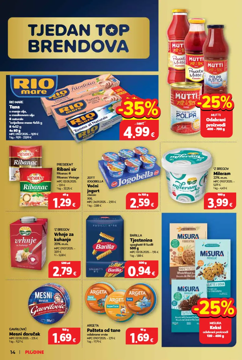 ‘z bregov mileram 22% m.m. mpc 09.07.2025. = 5,09 € 1 kg = 4,43 € ‘z bregov vrhnje za kuhanje 20% m.m. mpc 09.07.2025. = 3,59 € 1 l = 5,58 € zott jogobella voćni jogurt classic xxl mpc 24.09.2025. = 2,90 € 1 kg = 2,88 € president ribani sir ribanac ili ribanac vintage mpc 02.05.2025. = 1,59 € 1 kg = 32,25 € gavrilović mesni doručak mpc 02.05.2025. = 2,15 € 1 kg = 11,27 € argeta pašteta od tune odabrane vrste mpc 09.07.2025. = 2,19 € 1 kg = 17,79 € 1 1 . . 69 69 € 150 g 1 1 . . 69 69 € 95 g 3 3 . . 99 99 € 900 g 2 2 . . 79 79 € 500 ml 2 2 . . 59 59 € 6x 150 g 1 1 . . 29 29 € 40 g rio mare tuna s manje ulja, u maslinovom ulju ili naturale *ocijeđene mase 4x56 g ili 4x52 g 4x 80 g mpc 09.07.2025. = 9,09 € 1 kg = 19,19 - 23,99 € 4 4 . . 99 99 € 4x 80 g 7.69 € -35% -35% mutti odabrani proizvodi 400 - 700 g -25% -25% misura keksi odabrani proizvodi 120 - 400 g -25% -25% barilla tjestenina spaghetti ili fusilli 500 g mpc 02.05.2025. = 1,95 € 1 kg = 1,88 € 0 0 . . 94 94 € 500 g 14