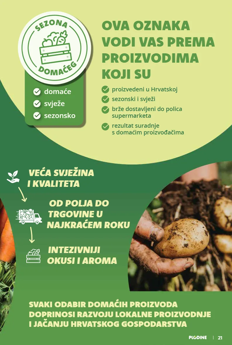 OVA OZNAKA VODI VAS PREMA PROIZVODIMA KOJI SU domaće svježe sezonsko D O M A Ć E G S E Z O N A INTEZIVNIJI OKUSI I AROMA VEĆA SVJEŽINA I KVALITETA OD POLJA DO TRGOVINE U NAJKRAĆEM ROKU proizvedeni u Hrvatskoj sezonski i svježi brže dostavljeni do polica supermarketa rezultat suradnje s domaćim proizvođačima SVAKI ODABIR DOMAĆIH PROIZVODA DOPRINOSI RAZVOJU LOKALNE PROIZVODNJE I JAČANJU HRVATSKOG GOSPODARSTVA 21