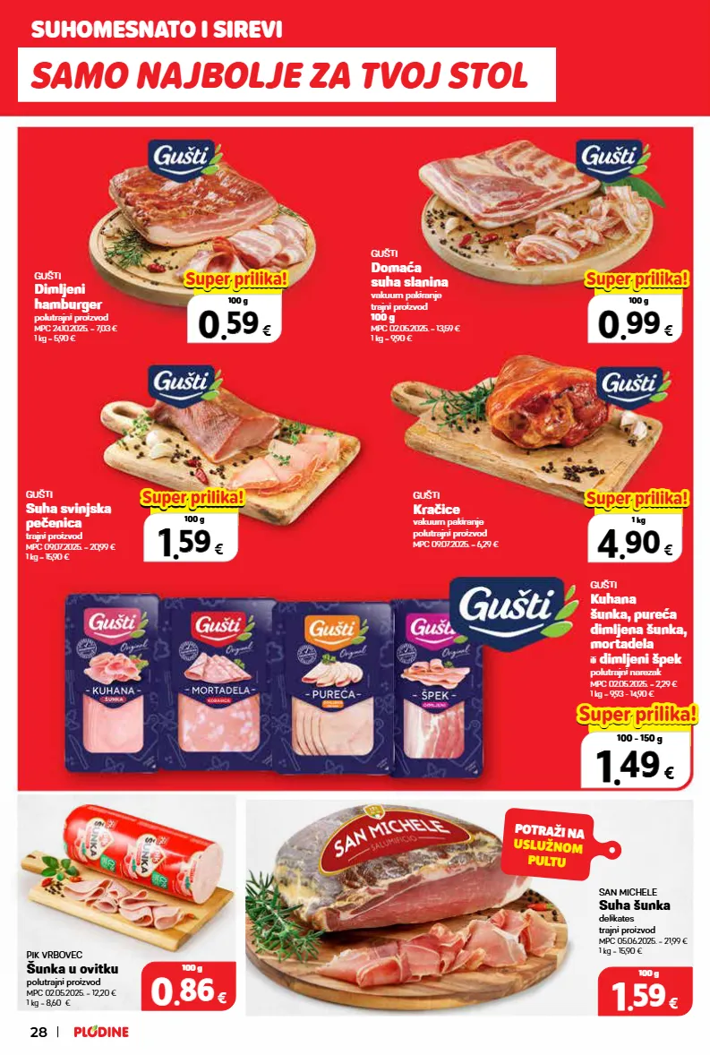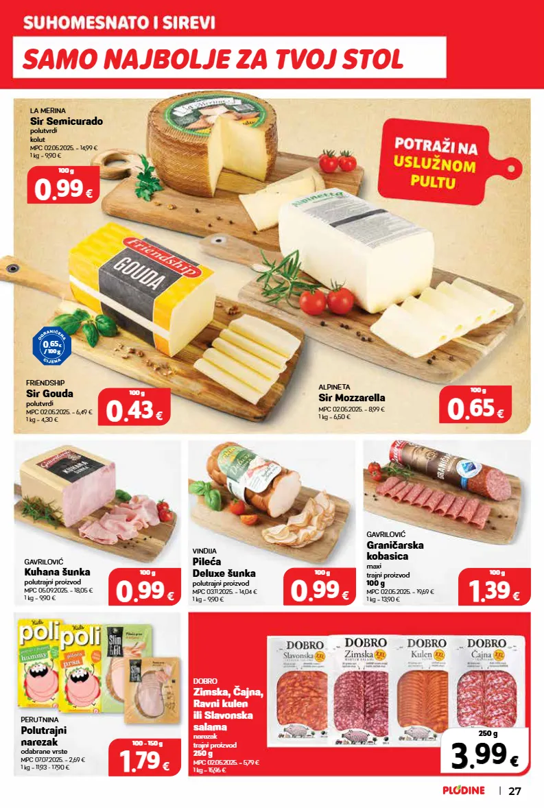 la merina sir semicurado polutvrdi kolut mpc 02.05.2025. = 14,99 € 1 kg = 9,90 € friendship sir gouda polutvrdi mpc 02.05.2025. = 6,49 € 1 kg = 4,30 € vindija pileća deluxe šunka polutrajni proizvod mpc 03.11.2025. = 14,04 € 1 kg = 9,90 € alpineta sir mozzarella mpc 02.05.2025. = 8,99 € 1 kg = 6,50 € gavrilović kuhana šunka polutrajni proizvod mpc 05.09.2025. = 18,05 € 1 kg = 9,90 € 0 0 . . 99 99 € 100 g 0 0 . . 99 99 € 100 g 0 0 . . 99 99 € 100 g 0 0 . . 65 65 € 100 g 0 0 . . 43 43 € 100 g gavrilović graničarska kobasica maxi trajni proizvod 100 g mpc 02.05.2025. = 19,69 € 1 kg = 13,90 € 1 1 . . 39 39 € 100 g 3 3 . . 99 99 € € 250 g dobro zimska, čajna, ravni kulen ili slavonska salama narezak trajni proizvod 250 g mpc 02.05.2025. = 5,79 € 1 kg = 15,96 € perutnina polutrajni narezak odabrane vrste mpc 07.07.2025. = 2,69 € 1 kg = 11,93 - 17,90 € 1 1 . . 79 79 € 100 - 150 g samo najbolje za tvoj stol 0 . 65 € / 100 g 27