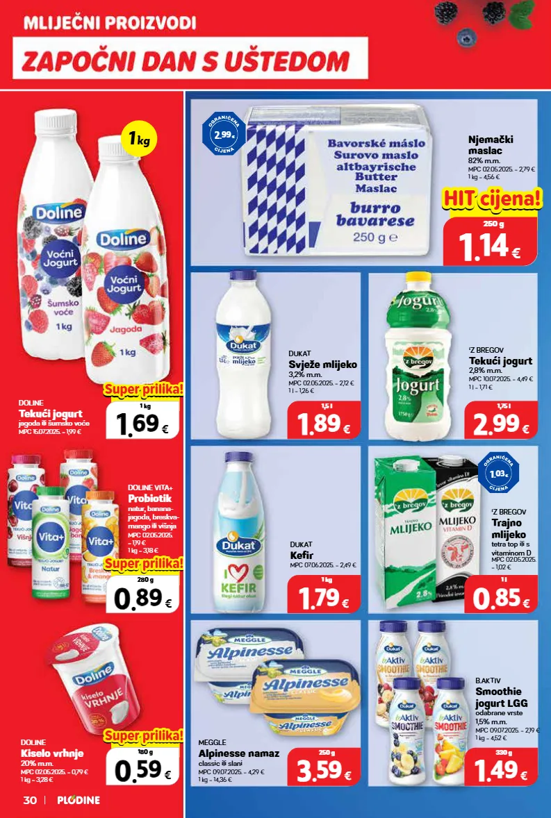 njemački maslac 82% m.m. mpc 02.05.2025. = 2,79 € 1 kg = 4,56 € ‘z bregov trajno mlijeko tetra top ili s vitaminom d mpc 02.05.2025. = 1,02 € ‘z bregov tekući jogurt 2,8% m.m. mpc 10.07.2025. = 4,49 € 1 l = 1,71 € dukat svježe mlijeko 3,2% m.m. mpc 02.05.2025. = 2,12 € 1 l = 1,26 € doline vita+ probiotik natur, banana- jagoda, breskva- mango ili višnja mpc 02.05.2025. = 1,19 € 1 kg = 3,18 € doline tekući jogurt jagoda ili šumsko voće mpc 15.07.2025. = 1,99 € dukat kefir mpc 07.06.2025. = 2,49 € b.aktiv smoothie jogurt lgg odabrane vrste 1,5% m.m. mpc 09.07.2025. = 2,19 € 1 kg = 4,52 € doline kiselo vrhnje 20% m.m. mpc 02.05.2025. = 0,79 € 1 kg = 3,28 € meggle alpinesse namaz classic ili slani mpc 09.07.2025. = 4,29 € 1 kg = 14,36 € top cijena! već od hit cijena! 1 1 . . 69 69 € 1 kg super prilika! super prilika! top cijena! već od hit cijena! 0 0 . . 89 89 € 280 g super prilika! super prilika! top cijena! već od hit cijena! 0 0 . . 59 59 € 180 g super prilika! super prilika! 0 0 . . 85 85 € 1 l 2 2 . . 99 99 € 1,75 l 1 1 . . 89 89 € 1,5 l 1 1 . . 79 79 € 1 kg 1 1 . . 49 49 € 330 g 3 3 . . 59 59 € 250 g 1 kg top cijena! već od hit cijena! 1 1 . . 14 14 € 250 g hit hit cijena! cijena! 2 . 99 € 1 . 03 € 30