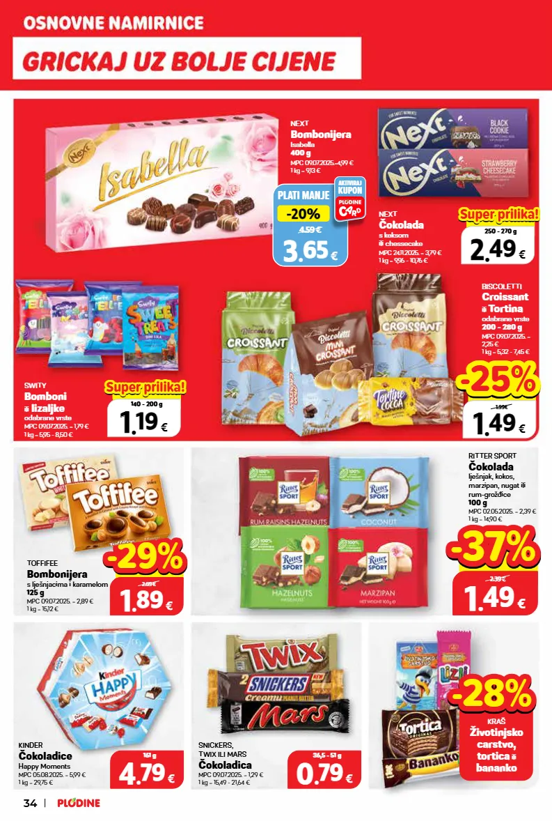 next čokolada s keksom ili chessecake mpc 24.11.2025. = 3,79 € 1 kg = 9,96 - 10,76 € ritter sport čokolada lješnjak, kokos, marzipan, nugat ili rum-grožđice 100 g mpc 02.05.2025. = 2,39 € 1 kg = 14,90 € swity bomboni ili lizaljke odabrane vrste mpc 09.07.2025. = 1,79 € 1 kg = 5,95 - 8,50 € kinder čokoladice happy moments mpc 05.08.2025. = 5,99 € 1 kg = 29,75 € snickers, twix ili mars čokoladica mpc 09.07.2025. = 1,29 € 1 kg = 15,49 - 21,64 € 1 1 . . 49 49 € 100 g 2.39 € -37% -37% 4 4 . . 79 79 € 161 g 0 0 . . 79 79 € 36,5 - 51 g top cijena! već od hit cijena! 2 2 . . 49 49 € 250 - 270 g super prilika! super prilika! top cijena! već od hit cijena! 1 1 . . 19 19 € 140 - 200 g super prilika! super prilika! biscoletti croissant ili tortina odabrane vrste 200 - 280 g mpc 09.07.2025. = 2,25 € 1 kg = 5,32 - 7,45 € 1 1 . . 49 49 € xxxxx 1.99€ -25% -25% next bombonijera isabella 400 g mpc 09.07.2025.=4,99 € 1 kg = 9,13 € plati manje 4.59 € -20% -20% 3 3 . . 65 65 € aktiviraj kupon kraš životinjsko carstvo, tortica ili bananko -28% -28% toffifee bombonijera s lješnjacima i karamelom 125 g mpc 09.07.2025. = 2,89 € 1 kg = 15,12 € 1 1 . . 89 89 € 125 g 2.69 € -29% -29% 34