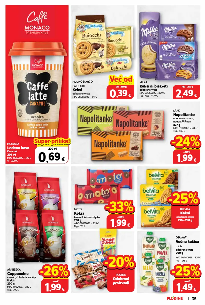 milka keksi ili biskviti odabrane vrste mpc 02.05.2025. = 3,39 € 1 kg = 9,58 - 17,79 € moto keksi kakao ili kakao-mlijeko 288 g mpc 09.07.2025. = 3,25 € 1 kg = 6,91 € belvita keksi odabrane vrste 225 - 250 g -25% -25% mulino bianco baiocchi keksi odabrane vrste mpc 08.08.2025. = 4,19 € kraš napolitanke chocolate cream, nougat ili limun 327 g mpc 09.07.2025. = 2,85 € 1 kg = 6,09 € 2 2 . . 49 49 € 140 - 260 g 1 1 . . 99 99 € 288 g 2.99 € -33% -33% top cijena! već od hit cijena! 0 0 . . 39 39 € 28 - 260 g već od već od 1 1 . . 99 99 € 327 g 2.65 € -24% -24% top cijena! već od hit cijena! 0 0 . . 69 69 € 230 ml super prilika! super prilika! roshen odabrani proizvodi -20% -20% 1 1 . . 49 49 € 200 g 1.99 € -25% -25% o’plant voćna kašica u tubi odabrane vrste 200 g mpc 06.06.2025. = 2,29 € 1 kg = 7,45 € arabesca cappuccino classic, čokolada, vanilija ili irish 200 g mpc 10.10.2025. = 2,85 € 1 kg = 9,95 € 1 1 . . 99 99 € 200 g 2.69 € -26% -26% monaco ledena kava caramel 230 ml mpc 10.06.2025. = 1,29 € 1 l = 3,00 € 35