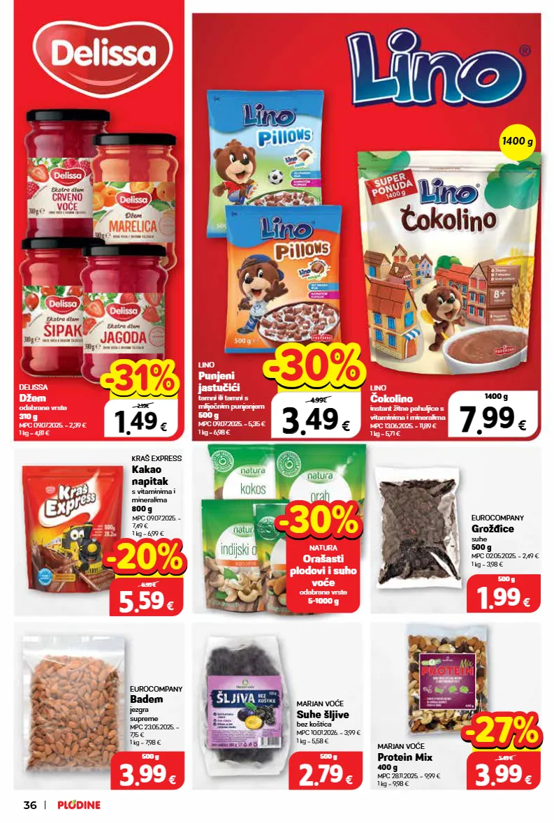 delissa džem odabrane vrste 310 g mpc 09.07.2025. = 2,39 € 1 kg = 4,81 € eurocompany badem jezgra supreme mpc 23.05.2025. = 7,15 € 1 kg = 7,98 € natura orašasti plodovi i suho voće odabrane vrste 5-1000 g -30% -30% marjan voće suhe šljive bez koštica mpc 10.01.2026. = 3,99 € 1 kg = 5,58 € kraš express kakao napitak s vitaminima i mineralima 800 g mpc 09.07.2025. = 7,49 € 1 kg = 6,99 € lino čokolino instant žitne pahuljice s vitaminima i mineralima mpc 13.06.2025. = 11,89 € 1 kg = 5,71 € lino punjeni jastučići tamni ili tamni s mliječnim punjenjem 500 g mpc 09.07.2025. = 5,35 € 1 kg = 6,98 € 5 5 . . 59 59 € 800 g 6.99 € -20% -20% marjan voće protein mix 400 g mpc 28.11.2025. = 9,99 € 1 kg = 9,98 € 3 3 . . 99 99 € 500 g 2 2 . . 79 79 € 500 g 3 3 . . 99 99 € 400 g 5.49 € -27% -27% 1 1 . . 49 49 € xxxxx 2.19€ -31% -31% 7 7 . . 99 99 € 1400 g eurocompany grožđice suhe 500 g mpc 02.05.2025. = 2,49 € 1 kg = 3,98 € 1 1 . . 99 99 € 500 g 3 3 . . 49 49 € xxxxx 4.99€ -30% -30% 1400 g 36
