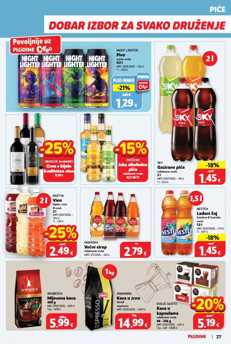 diego de almagro crno ili bijelo kvalitetno vino 0,75 l -25% -25% bastya vino bijelo, crno ili rosé 2 l mpc 09.07.2025. = 3,54 € 1 l = 1,25 € 2 2 . . 49 49 € 2 l 3.33 € -25% -25% maraska voćni sirup odabrane vrste mpc 27.11.2025. = 4,10 € nestea ledeni čaj breskva ili šumsko voće 1,5 l mpc 02.09.2025. = 1,79 € 1 l = 0,97 € 1 1 . . 45 45 € 1,5 l -18% -18% 1.79 € 2 2 . . 79 79 € 1 l sky gazirano piće odabrane vrste 2 l mpc 09.07.2025. = 1,95 € 1 l = 0,73 € 1 1 . . 45 45 € 2 l -18% -18% 1.79 € zvečevo jaka alkoholna pića odabrane vrste 0,7 l ili 1 l -15% -15% dolce gusto kava u kapsulama odabrane vrste 88 - 256 g mpc 09.07.2025. = 6,99 € 1 kg = 5,81 - 58,98 € 5 5 . . 19 19 € 88 - 256 g 6.49 € -20% -20% anamaria kava u zrnu vendi espresso mpc 02.05.2025. = 24,99 € 14 14 . . 99 99 € 1 kg plati manje 1.65 € -21% -21% 1 1 . . 29 29 € ponuda night lighter pivo razne vrste 0,5 l mpc 20.05.2025. = 1,65 € 1 l = 2,58 € arabesca mljevena kava 400 g mpc 09.07.2025. = 8,59 € 1 kg = 14,98 € 5 5 . . 99 99 € 400 g 1 kg 2 l 2 l 1,5 l 37