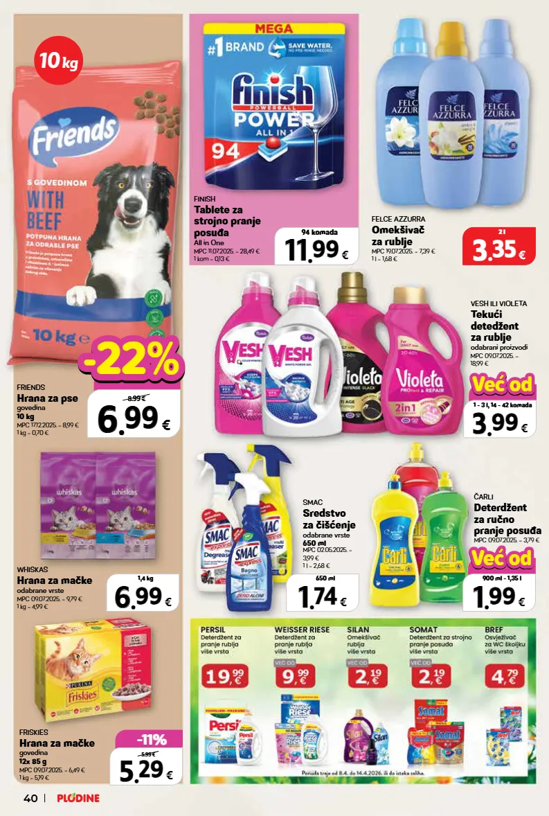 whiskas hrana za mačke odabrane vrste mpc 09.07.2025. = 9,79 € 1 kg = 4,99 € friskies hrana za mačke govedina 12x 85 g mpc 09.07.2025. = 6,49 € 1 kg = 5,19 € 5 5 . . 29 29 € 12x 85 g -11% -11% 5.99 € 6 6 . . 99 99 € 1,4 kg friends hrana za pse govedina 10 kg mpc 17.12.2025. = 8,99 € 1 kg = 0,70 € 10 kg čarli deterdžent za ručno pranje posuđa mpc 09.07.2025. = 3,79 € top cijena! već od hit cijena! 1 1 . . 99 99 € 900 ml - 1,35 l već od već od 11 11 . . 99 99 € 94 komada finish tablete za strojno pranje posuđa all in one mpc 11.07.2025. = 28,49 € 1 kom = 0,13 € vesh ili violeta tekući detedžent za rublje odabrani proizvodi mpc 09.07.2025. = 18,99 € top cijena! već od hit cijena! 3 3 . . 99 99 € 1 - 3 l, 14 - 42 komada već od već od 1 1 . . 74 74 € 650 ml smac sredstvo za čišćenje odabrane vrste 650 ml mpc 02.05.2025. = 3,99 € 1 l = 2,68 € felce azzurra omekšivač za rublje mpc 19.07.2025. = 7,39 € 1 l = 1,68 € 3 3 . . 35 35 € 2 l 6 6 . . 99 99 € 125 ml 8.99 € -22% -22% 40