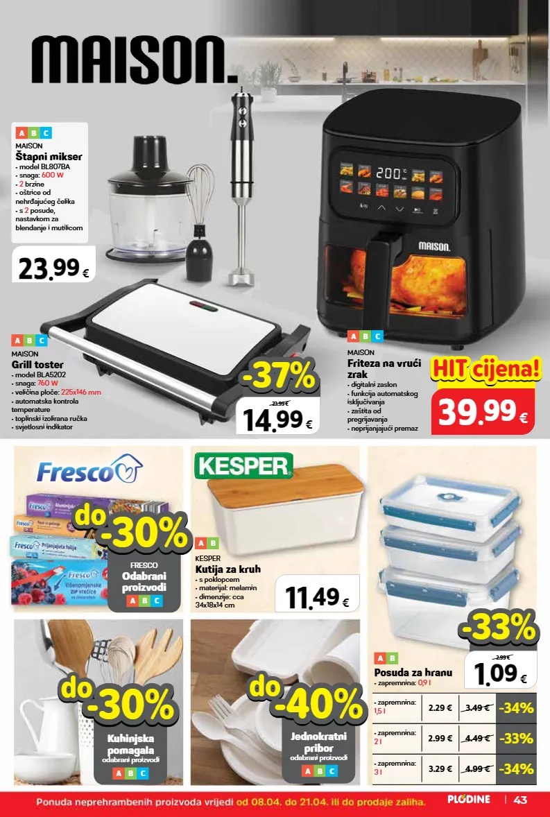 maison štapni mikser • model bl807ba • snaga: 600 w • 2 brzine • oštrice od nehrđajućeg čelika • s 2 posude, nastavkom za blendanje i mutilicom a b c maison grill toster • model bla5202 • snaga: 760 w • veličina ploče: 225x146 mm • automatska kontrola temperature • toplinski izolirana ručka • svjetlosni indikator a b c maison friteza na vrući zrak • digitalni zaslon • funkcija automatskog isključivanja • zaštita od pregrijavanja • neprijanjajući premaz a b c 23 23 . . 99 99 € 14 14 . . 99 99 € 23.99 € -37% -37% top cijena! već od hit cijena! 39 39 . . 99 99 € hit hit cijena! cijena! do do fresco odabrani proizvodi -30% -30% a b c -34% 2.29 € 3.49 € • zapremnina: 1,5 l -33% 2.99 € 4.49 € • zapremnina: 2 l -34% 3.29 € 4.99 € • zapremnina: 3 l 1 1 . . 09 09 € 2.99 € -33% -33% posuda za hranu • zapremnina: 0,9 l a b do do kuhinjska pomagala odabrani proizvodi -30% -30% a b c do do jednokratni pribor odabrani proizvodi -40% -40% a b c kesper kutija za kruh • s poklopcem • materijal: melamin • dimenzije: cca 34x18x14 cm a b 11 11 . . 49 49 € 43