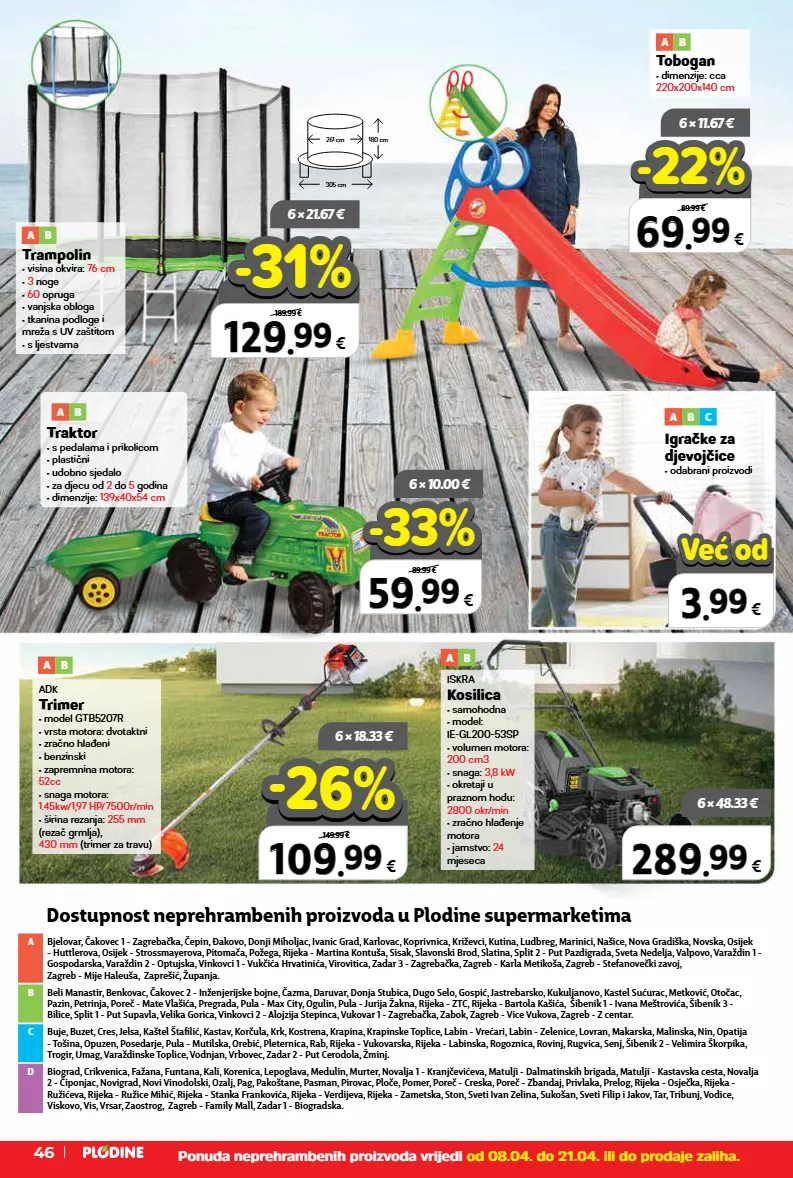 traktor • s pedalama i prikolicom • plastični • udobno sjedalo • za djecu od 2 do 5 godina • dimenzije: 139x40x54 cm trampolin • visina okvira: 76 cm • 3 noge • 60 opruga • vanjska obloga • tkanina podloge i mreža s uv zaštitom • s ljestvama a b 3 3 . . 99 99 € već od već od 59 59 . . 99 99 € 89.99 € -33% -33% 69 69 . . 99 99 € 89.99 € -22% -22% 6 × 10.00 € a b iskra kosilica • samohodna • model: ie-gl200-53sp • volumen motora: 200 cm3 • snaga: 3,8 kw • okretaji u praznom hodu: 2800 okr/min • zračno hlađenje motora • jamstvo: 24 mjeseca 289 289 . . 99 99 € 6 × 48.33 € a b 6 × 11.67 € igračke za djevojčice • odabrani proizvodi a b c 109 109 . . 99 99 € 149.99 € -26% -26% 6 × 18.33 € adk trimer • model gtb5207r • vrsta motora: dvotaktni • zračno hlađeni • benzinski • zapremnina motora: 52cc • snaga motora: 1.45kw/1,97 hp/7500r/min • širina rezanja: 255 mm (rezač grmlja), 430 mm (trimer za travu) a b tobogan • dimenzije: cca 220x200x140 cm a b beli manastir, benkovac, čakovec 2 - inženjerijske bojne, čazma, daruvar, donja stubica, dugo selo, gospić, jastrebarsko, kukuljanovo, kastel sućurac, metković, otočac, pazin, petrinja, poreč - mate vlašića, pregrada, pula - max city, ogulin, pula - jurija žakna, rijeka - ztc, rijeka - bartola kašića, šibenik 1 - ivana meštrovića, šibenik 3 - bilice, split 1 - put supavla, velika gorica, vinkovci 2 - alojzija stepinca, vukovar 1 - zagrebačka, zabok, zagreb - vice vukova, zagreb - z centar. b buje, buzet, cres, jelsa, kaštel štafilić, kastav, korčula, krk, kostrena, krapina, krapinske toplice, labin - vrećari, labin - zelenice, lovran, makarska, malinska, nin, opatija - tošina, opuzen, posedarje, pula - mutilska, orebić, pleternica, rab, rijeka - vukovarska, rijeka - labinska, rogoznica, rovinj, rugvica, senj, šibenik 2 - velimira škorpika, trogir, umag, varaždinske toplice, vodnjan, vrbovec, zadar 2 - put cerodola, žminj. c biograd, crikvenica, fažana, funtana, kali, korenica, lepoglava, medulin, murter, novalja 1 - kranjčevićeva, matulji - dalmatinskih brigada, matulji - kastavska cesta, novalja 2 - čiponjac, novigrad, novi vinodolski, ozalj, pag, pakoštane, pasman, pirovac, ploče, pomer, poreč - creska, poreč - zbandaj, privlaka, prelog, rijeka - osječka, rijeka - ružićeva, rijeka - ružice mihić, rijeka - stanka frankovića, rijeka - verdijeva, rijeka - zametska, ston, sveti ivan zelina, sukošan, sveti filip i jakov, tar, tribunj, vodice, viskovo, vis, vrsar, zaostrog, zagreb - family mall, zadar 1 - biogradska. d a bjelovar, čakovec 1 - zagrebačka, čepin, đakovo, donji miholjac, ivanic grad, karlovac, koprivnica, križevci, kutina, ludbreg, marinici, našice, nova gradiška, novska, osijek - huttlerova, osijek - strossmayerova, pitomača, požega, rijeka - martina kontuša, sisak, slavonski brod, slatina, split 2 - put pazdigrada, sveta nedelja, valpovo, varaždin 1 - gospodarska, varaždin 2 - optujska, vinkovci 1 - vukčića hrvatinića, virovitica, zadar 3 - zagrebačka, zagreb - karla metikoša, zagreb - stefanovečki zavoj, zagreb - mije haleuša, zaprešić, županja. dostupnost neprehrambenih proizvoda u plodine supermarketima 129 129 . . 99 99 € 189.99 € 6 × 21.67 € -31% -31% ponuda neprehrambenih proizvoda vrijedi od 08.04. do 21.04. ili do prodaje zaliha. 261 cm 180 cm 305 cm 46