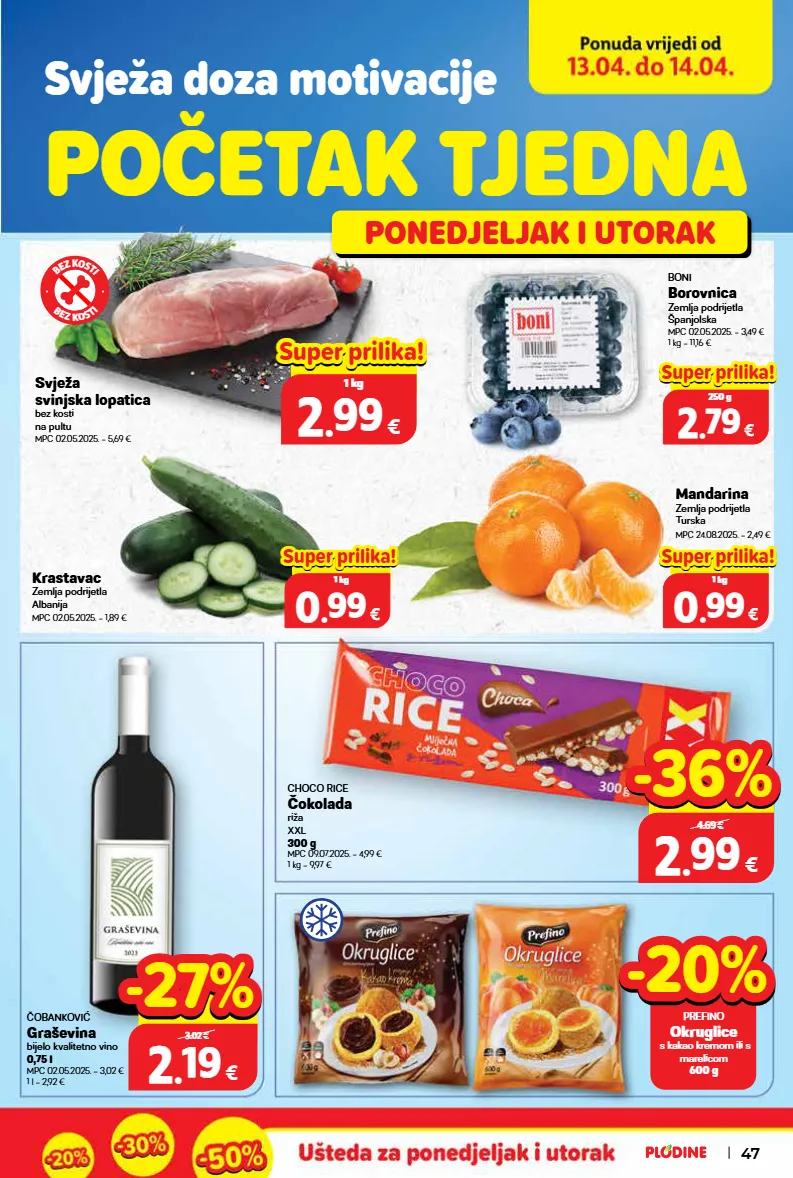 prefino okruglice s kakao kremom ili s marelicom 600 g -20% -20% choco rice čokolada riža xxl 300 g mpc 09.07.2025. = 4,99 € 1 kg = 9,97 € čobanković graševina bijelo kvalitetno vino 0,75 l mpc 02.05.2025. = 3,02 € 1 l = 2,92 € boni borovnica zemlja podrijetla španjolska mpc 02.05.2025. = 3,49 € 1 kg = 11,16 € krastavac zemlja podrijetla albanija mpc 02.05.2025. = 1,89 € svježa svinjska lopatica bez kosti na pultu mpc 02.05.2025. = 5,69 € 2 2 . . 99 99 € 300 g 4.69 € -36% -36% mandarina zemlja podrijetla turska mpc 24.08.2025. = 2,49 € top cijena! već od hit cijena! 2 2 . . 99 99 € 1 kg super prilika! super prilika! top cijena! već od hit cijena! 2 2 . . 79 79 € 250 g super prilika! super prilika! top cijena! već od hit cijena! 0 0 . . 99 99 € 1 kg super prilika! super prilika! top cijena! već od hit cijena! 0 0 . . 99 99 € 1 kg super prilika! super prilika! 2 2 . . 19 19 € 0,75 l 3.02 € -27% -27% ponedjeljak i utorak početak tjedna svježa doza motivacije b e z k o s t i b e z k o s t i 47